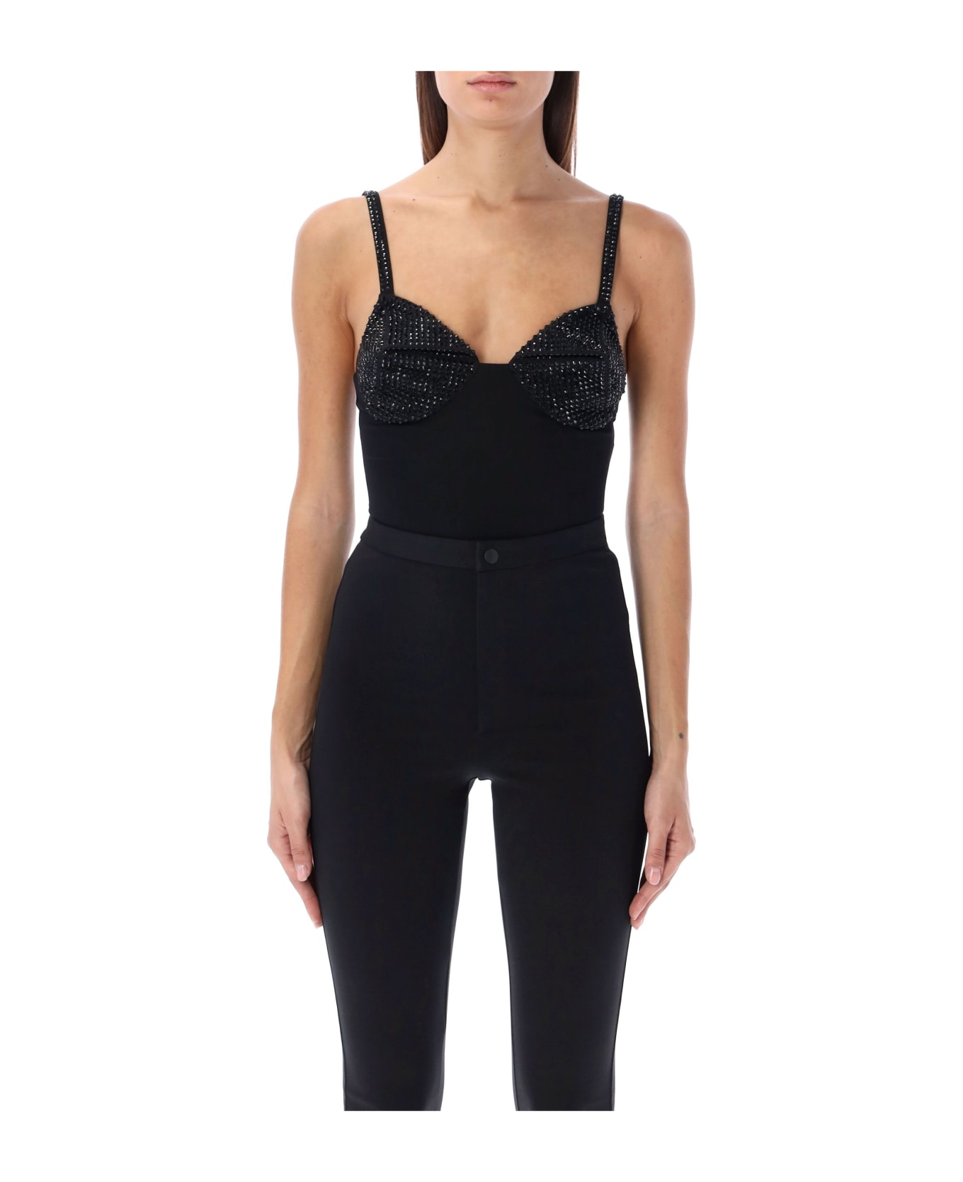 Stretch Crystal Embellished Bodysuit By Area. Featuring: Crystal Pyramid Cups Crystal Straps With Lobster Clasp Fastening At Back Rear Zip Closure Crotch Snap Buttons Model Is 1,72 M Tall And She's Wearing Size S