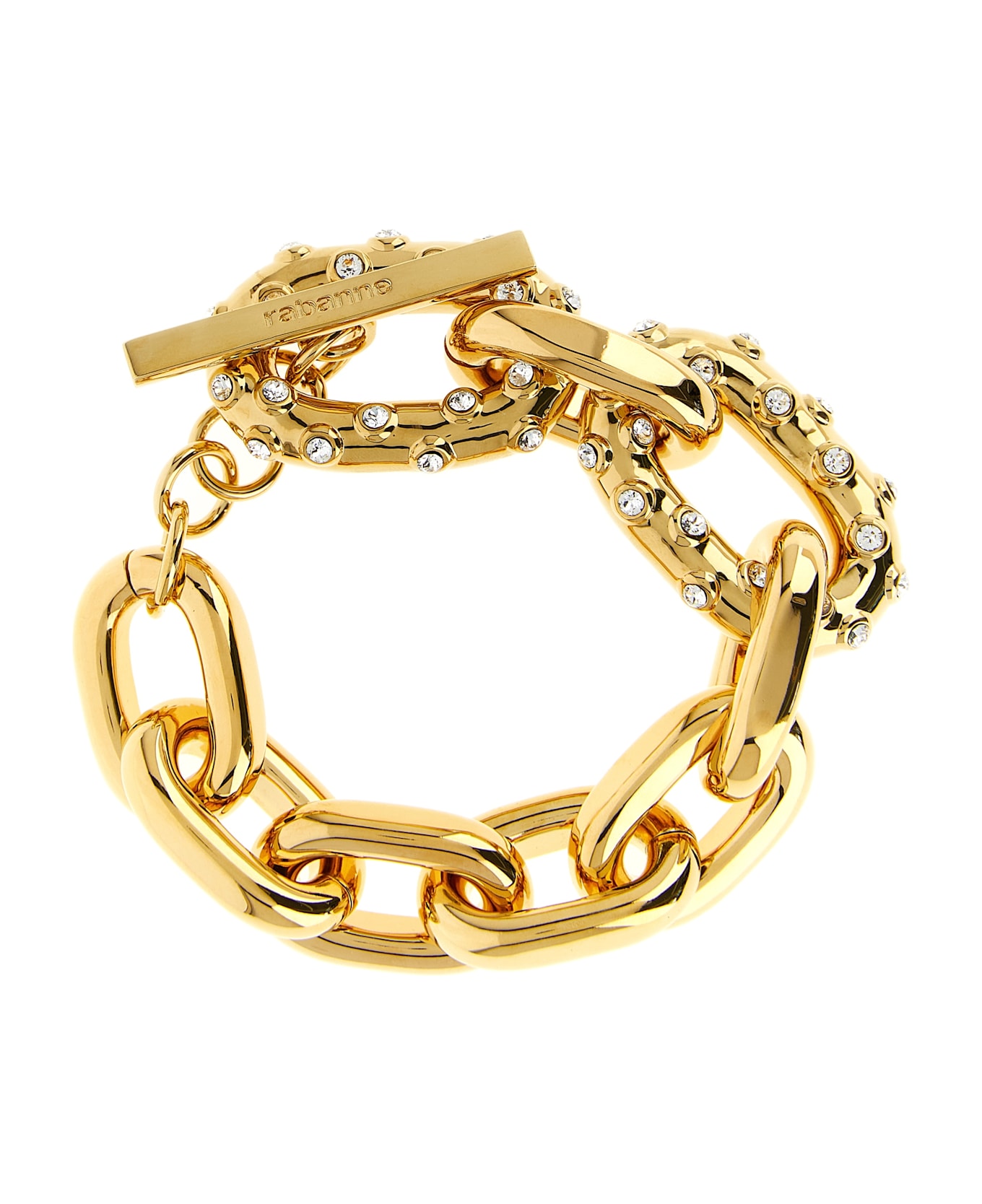 'XL Link' chain bracelet composed of wide woven metal links with crystal application, adjustable, hook closure. Composition: 70% brass, 30% glass
