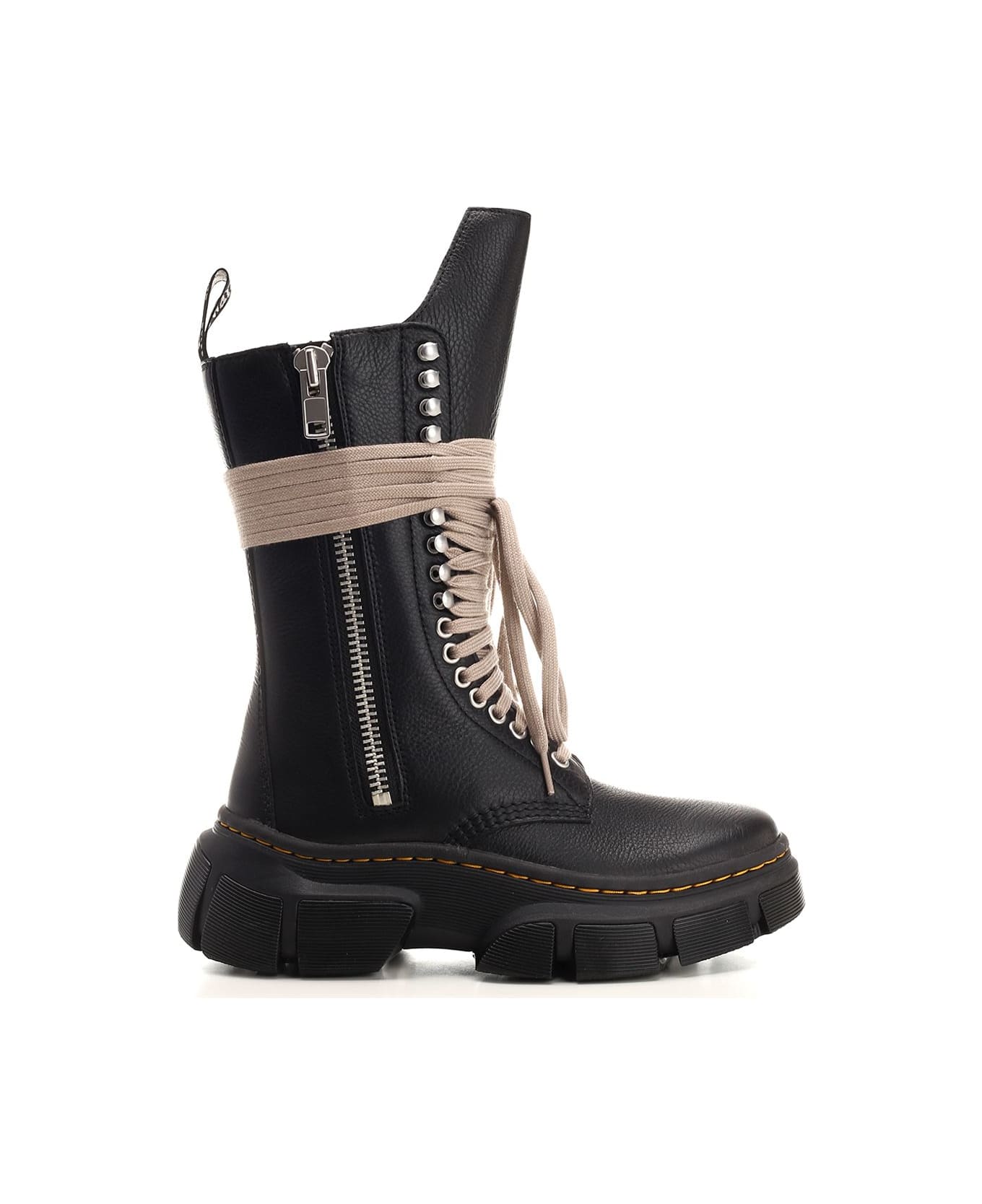 DR. MARTENS X RICK OWENS 1918 calf length boots in black cow leather, featuring exaggerated laces, extended and geometric tongue, rubber sole with signature yellow stiching as Dr. Martens signature.