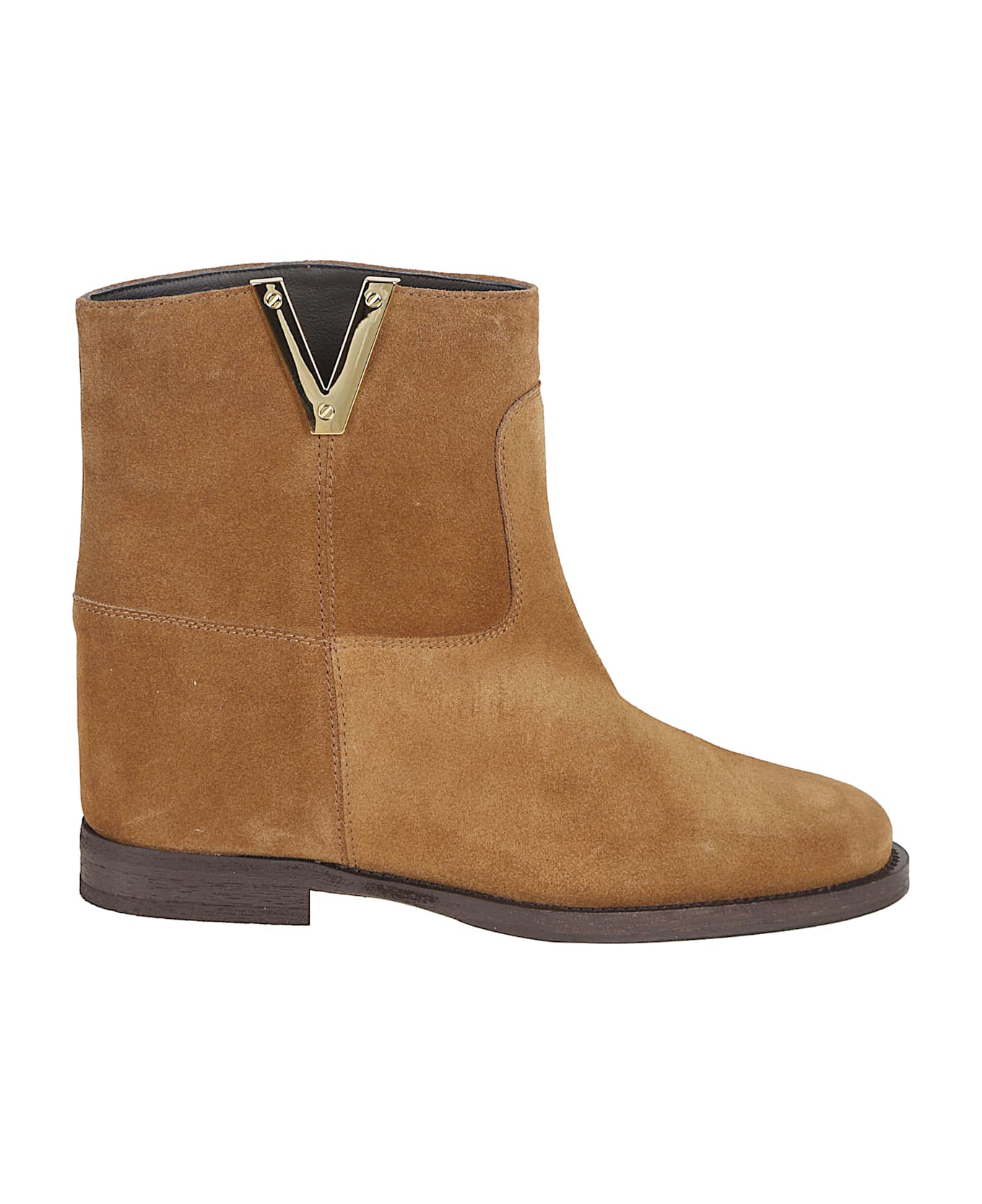 Calfskin ankle boot from VIA ROMA 15. 5 cm internal wedge; rubber sole; slip-on design. Featuring a decorative gold-tone metal plaque.