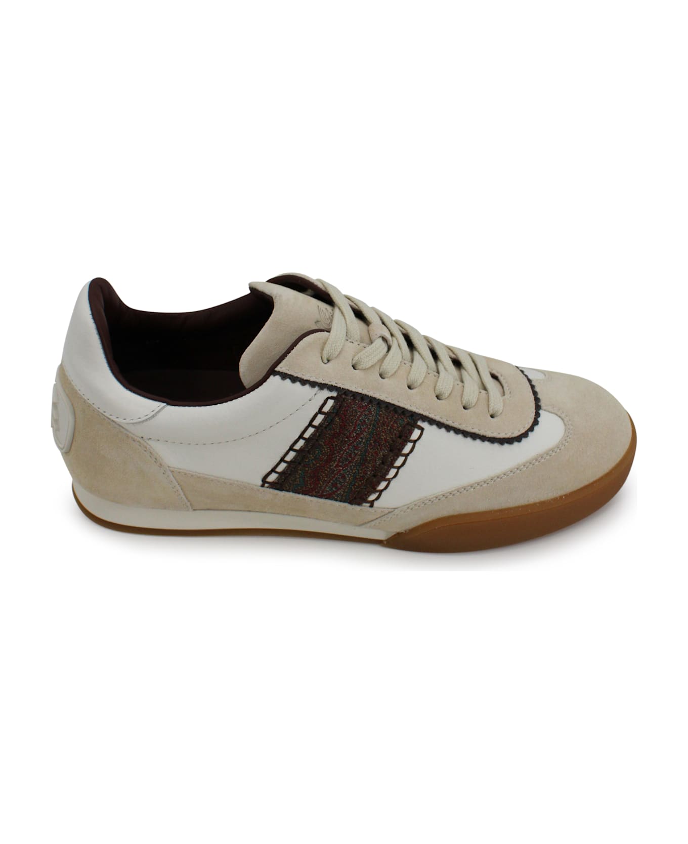 Features Color: beige Patterned insert Round toe Front lace closure Flat rubber sole Tone-on-tone stitching Origin: Italy