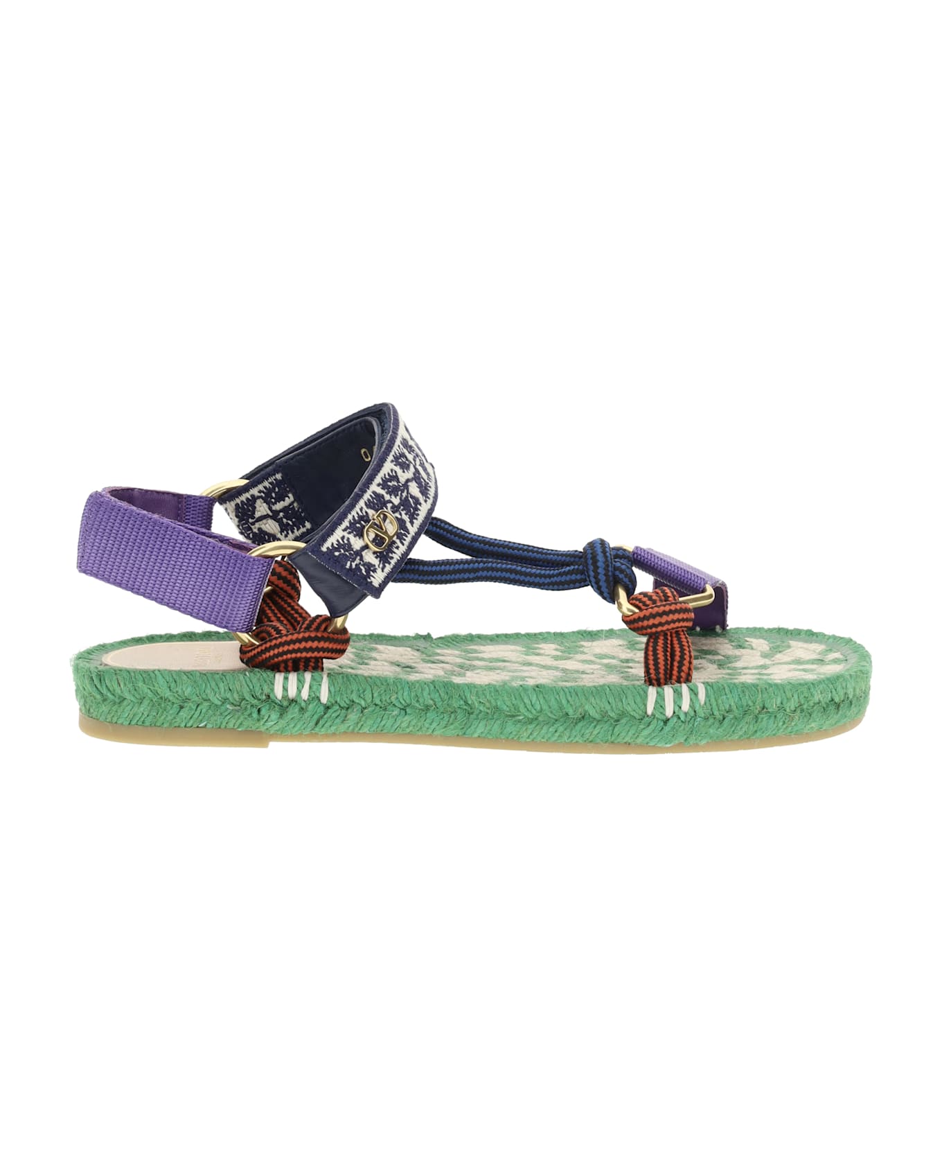 Valentino garavani's lake powell sandals combine the house's iconic style with a practical, contemporary design. made with a round toe and flat rope sole, they offer relaxed elegance perfect for the warm season. the double velcro strap closure, both front and back, ensures comfort and an adjustable fit. the distinguishing detail? the unmistakable metallic vlogo applied on the front strap, an emblem of the brand's sophisticated aesthetic. the model is completed by the logoed insole and sartorial attention to materials, for a casual yet refined look.