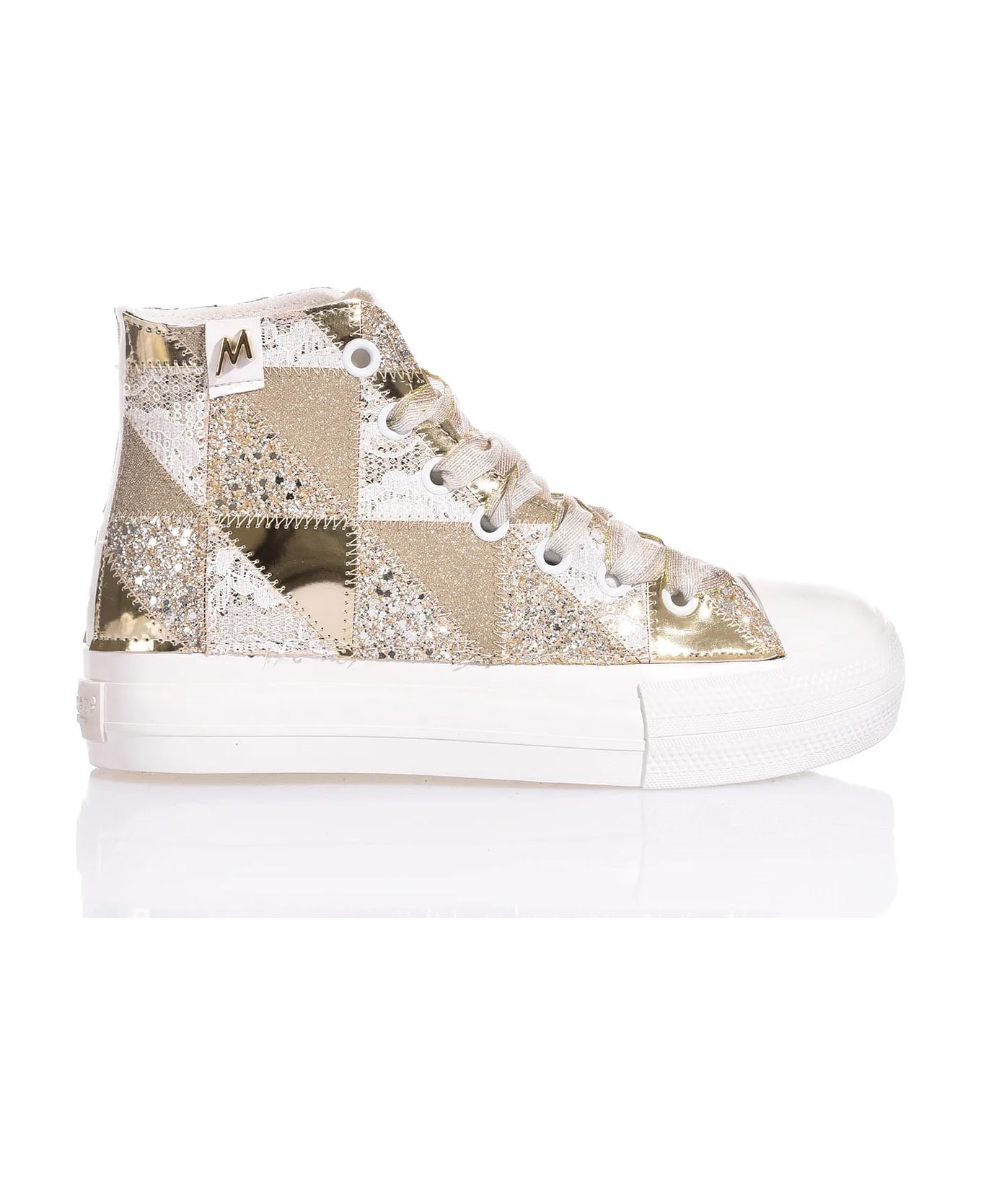 Mimanera Airlines Platform Gold Patch is the versatile and elegant sneaker of this season. Inspired by the classic Converse model, these sneakers with an all-white platform sole are designed to elongate the figure while ensuring exceptional comfort. Entirely covered by a finely crafted patchwork made of various high-quality materials, all in shades of gold for a glamorous and sophisticated look. The look is completed with beige and cream laces, and gold accents. This model runs slightly large, so if you are between sizes (e. g. , 36. 5), choose size 36.