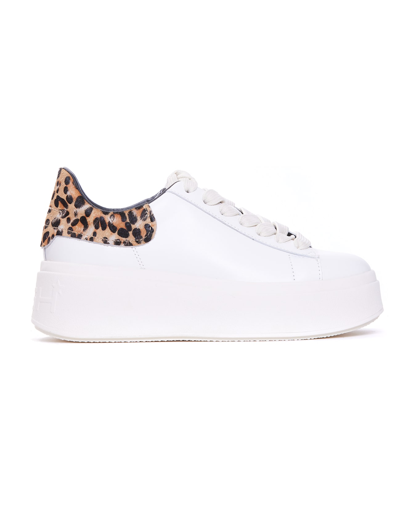 Ash white and leopard brown Moby sneakers, leather upper and rubber sole, round toe, lace closure, tongue, lateral and back logo, tone sur tone