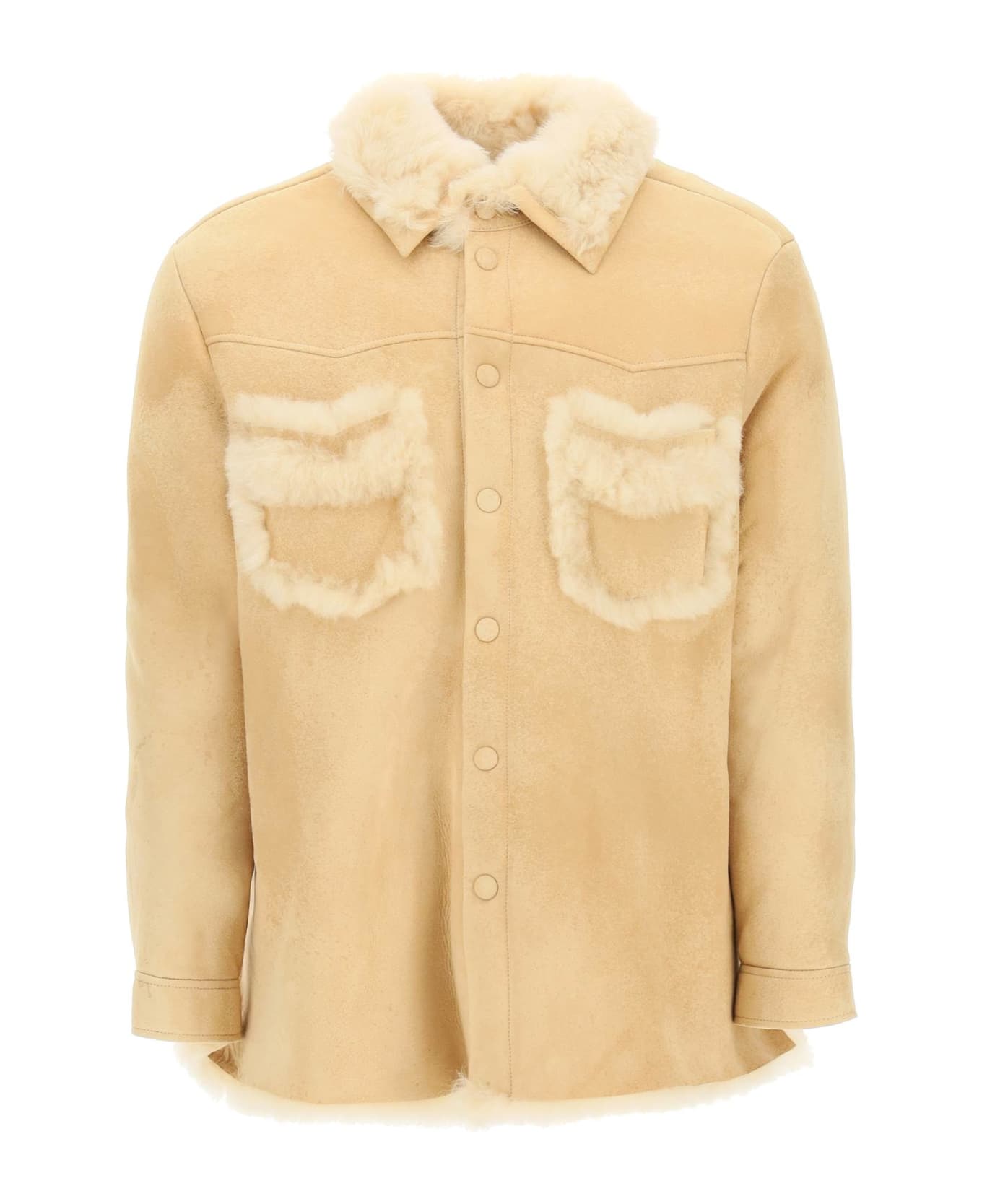 ERL jacket in suede leather with full shearling lining. Oversize shirt fit with front press-stud fastening and classic shearling pointed collar, two breast patch pockets with shearling trim and single press-stud cuffs. The model is 183 cm tall and wears a size M.