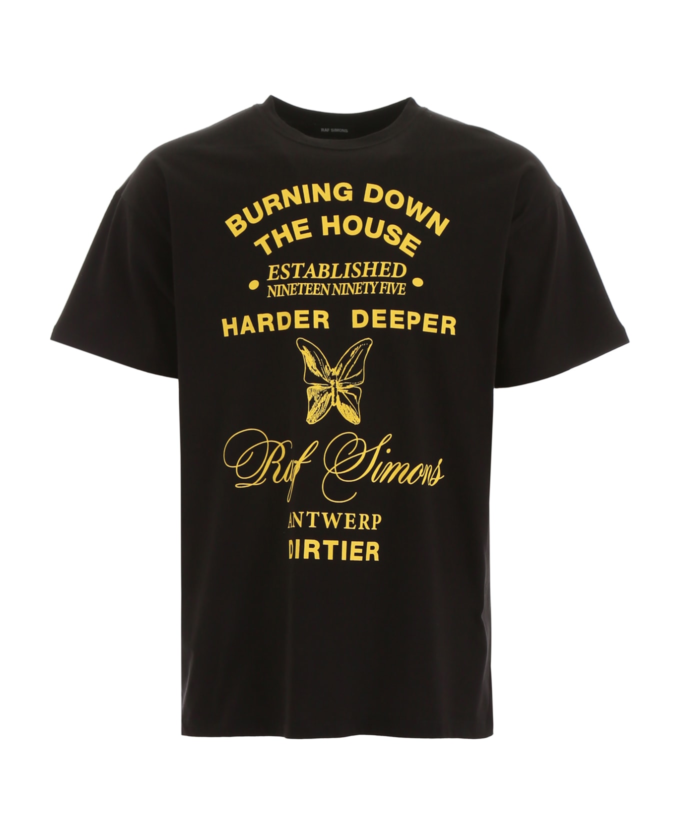 Raf Simons cotton jersey T-shirt with contrast "Burning Down The House" print on the front. Ribbed neck, stitched hems. Model height is 183 cm and he is wearing a size M.