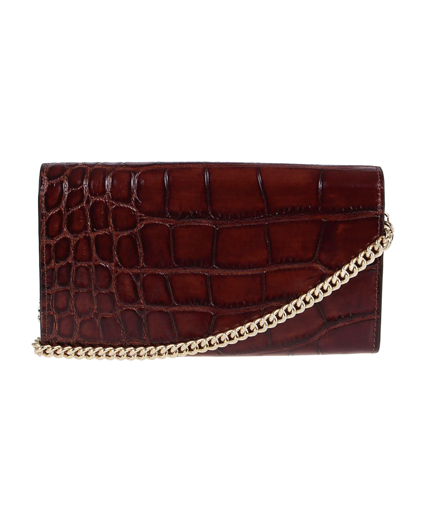 Brown leather wallet, crocodile print, metal closure, removable chain shoulder strap, gold-colored hardware, two internal scoparti, pocket with zip fastening, card holder, front logo detail
