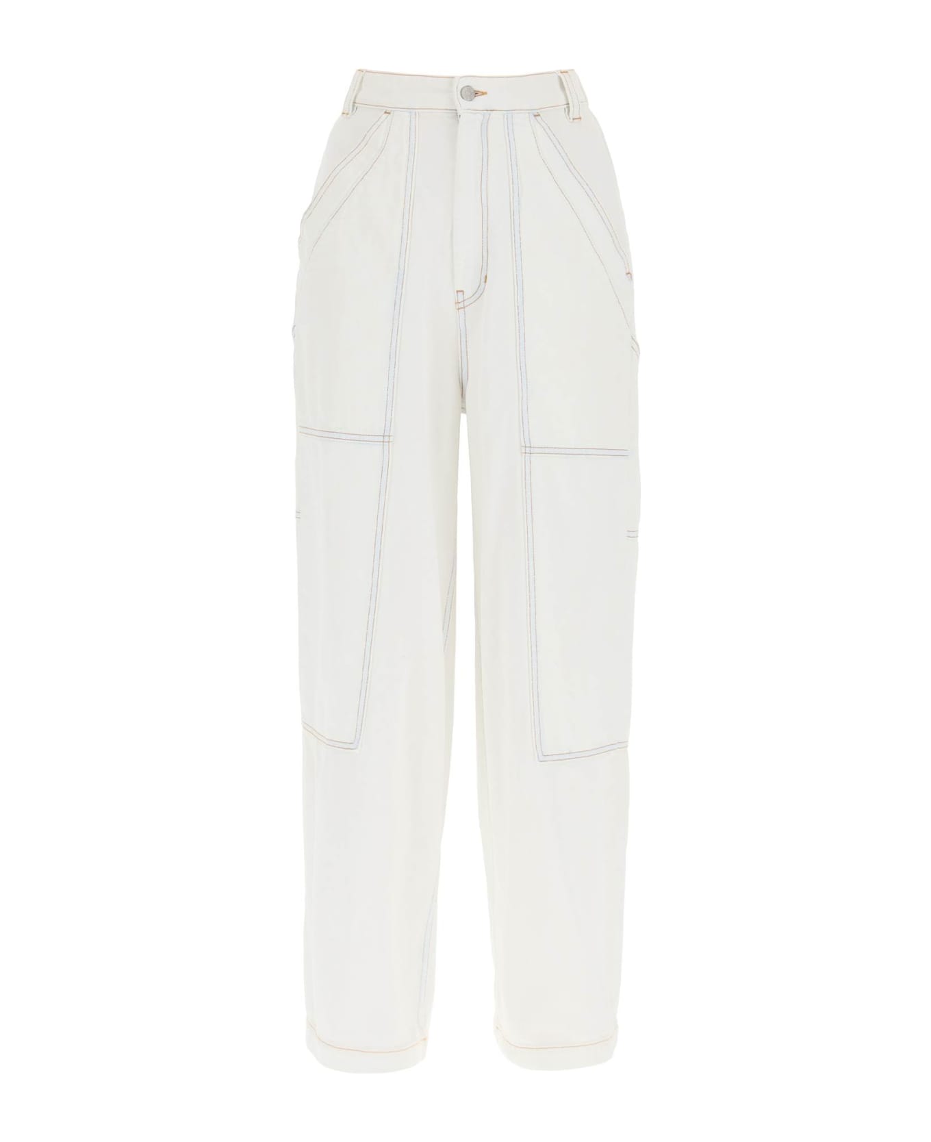 Workwear-inspired jeans in non-stretch denim with super bleached wash by MM6 Maison Margiela. Three-pocket style with reinforced panels, contrast stitching and utility pockets on the legs. High-rise wide-leg cut fastened with zip fly and top button. Jacron and signature horizontal stitching on the back. The model is 177 cm tall and wears a size IT 38.