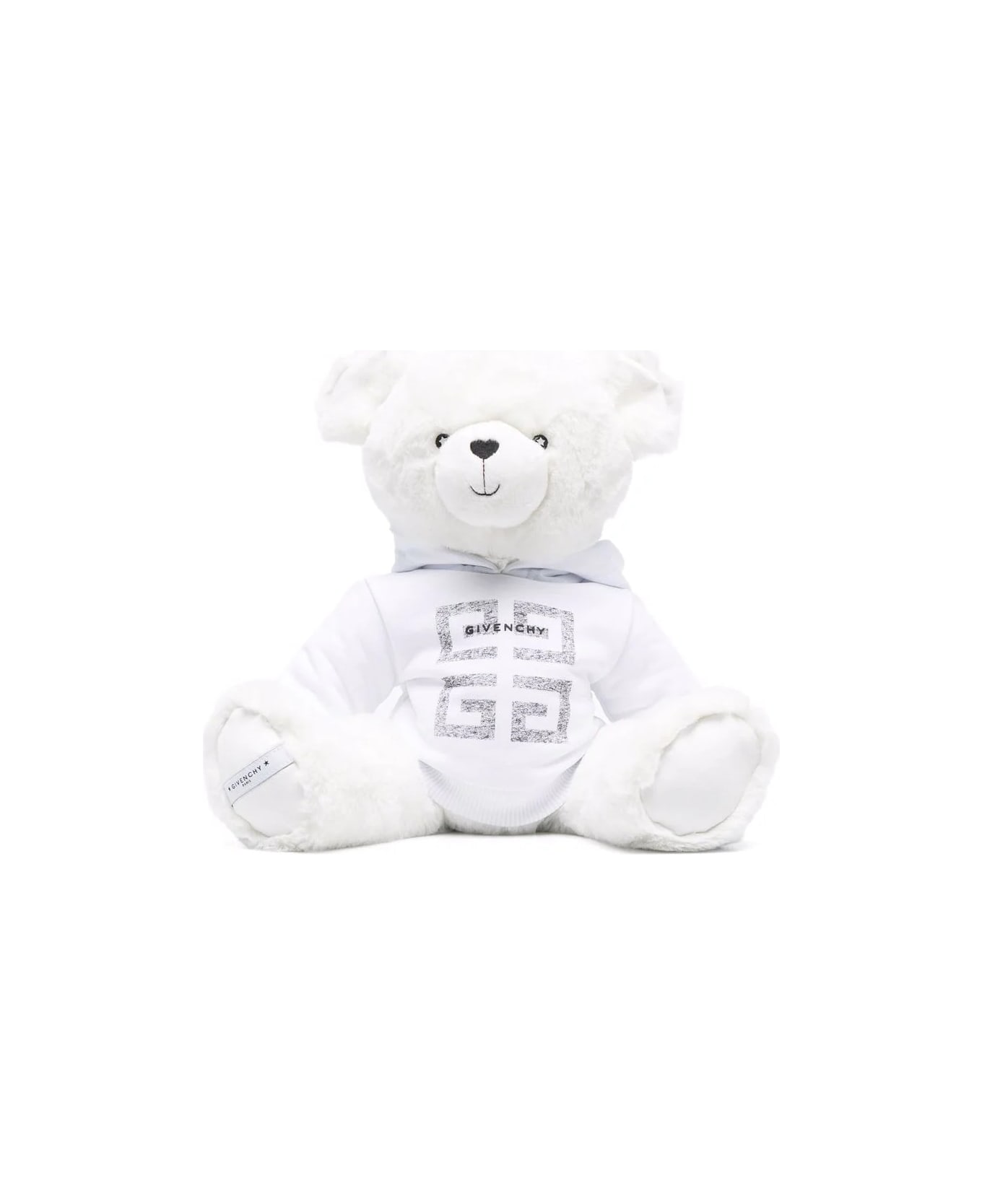 White teddy bear by GIVENCHY embellished with a white sweatshirt with 4G print on the front. Signature GIVENCHY Paris printed on the front of the sweatshirt. GIVENCHY Paris tag sewn under the right paw. Composition: Composition: 100% Polyester; 86% Cotton, 14% Polyester.