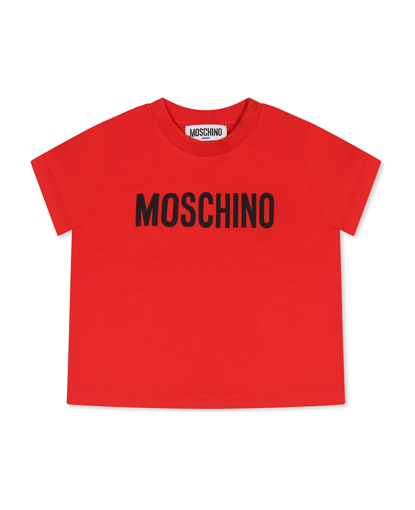 Red t-shirt from the Moschino Kids brand, made of cotton, with short sleeves, ribbed crew neck and snap button closure on the shoulder. It is embellished with contrasting black logo on the front.