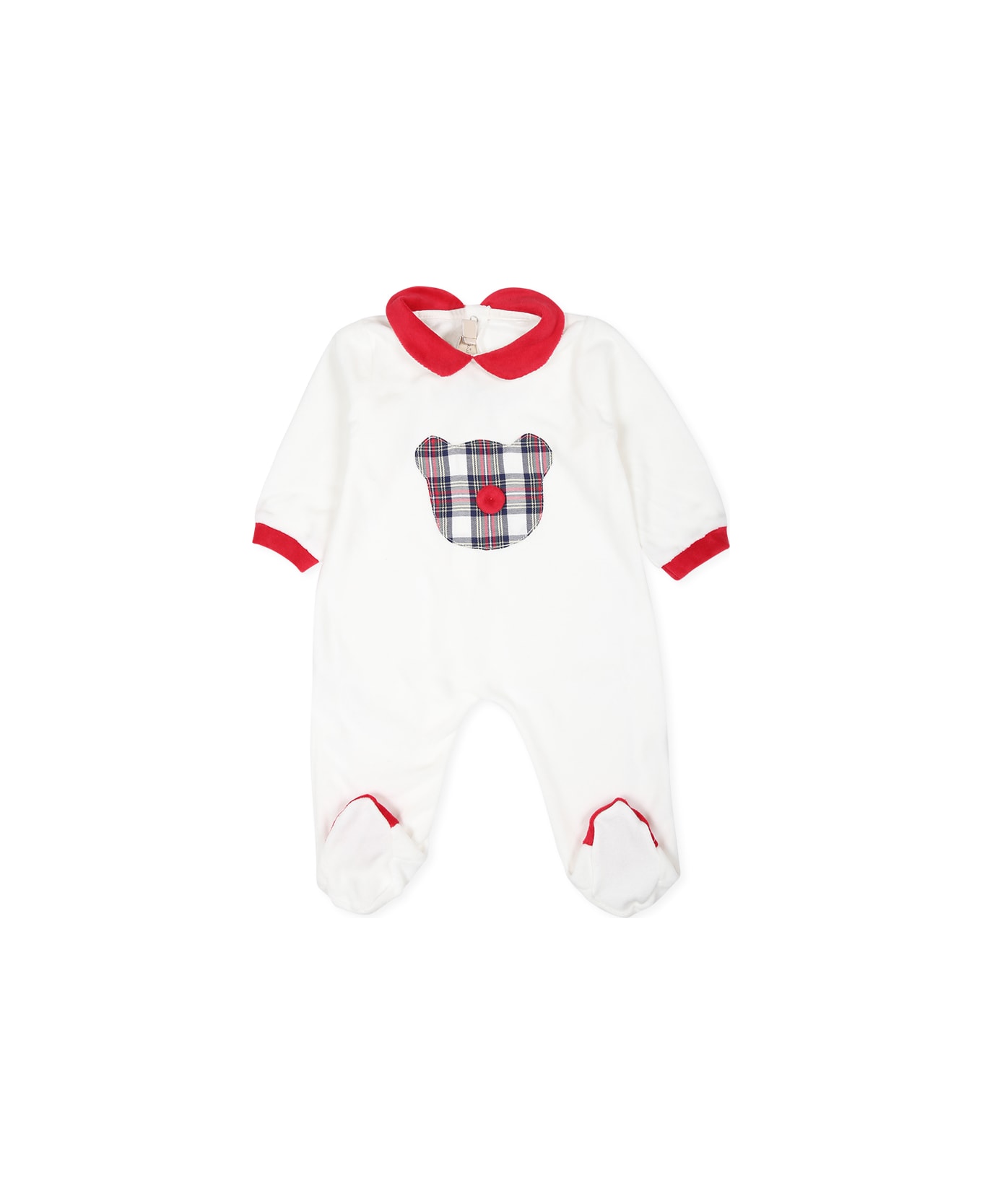 Ivory babygrow, made from soft chenille, with rounded collar in a contrasting red and popper fastening on the back; it is embellished with bear embroideried on the front, made from multicolor tartan check fabric and decorative button in red, like the details of cuffs and feet.