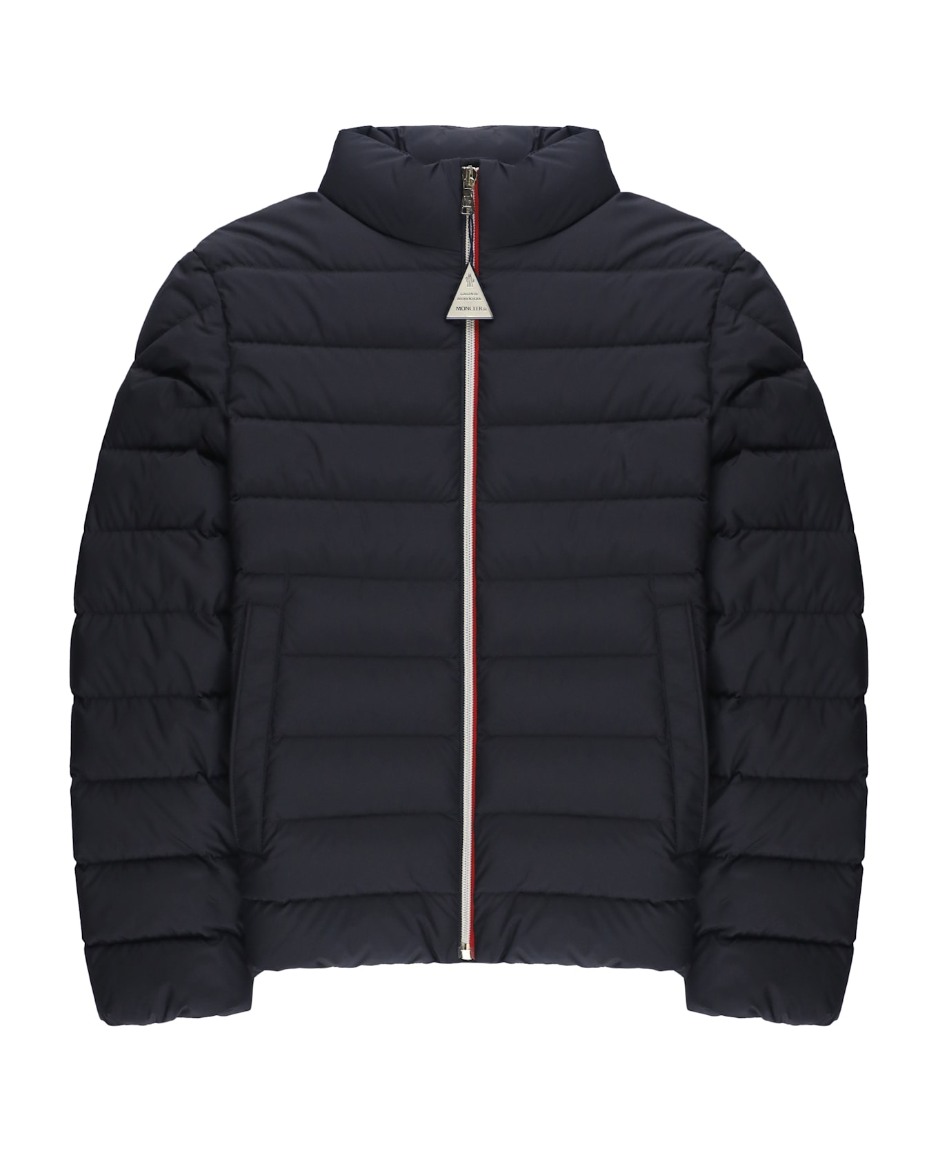 - Blue Moncler Enfant down jacket for girl - High neck - Long sleeves - Front zip fastening - Contrasting color logoed patch at left sleeve - Two side buttons pockets