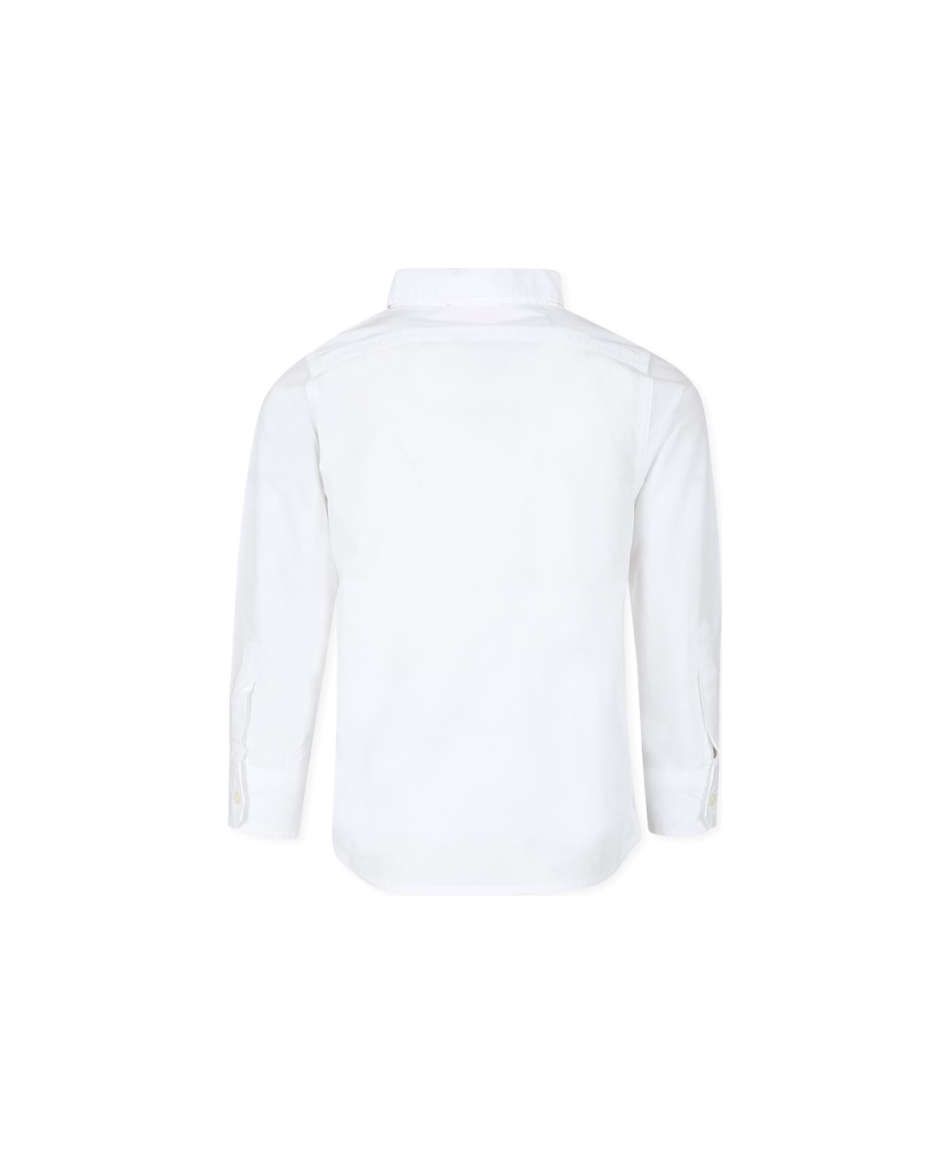 White cotton shirt, long sleeves, with pointed collar and front button closure. It is embellished with logo embroidered on the collar.