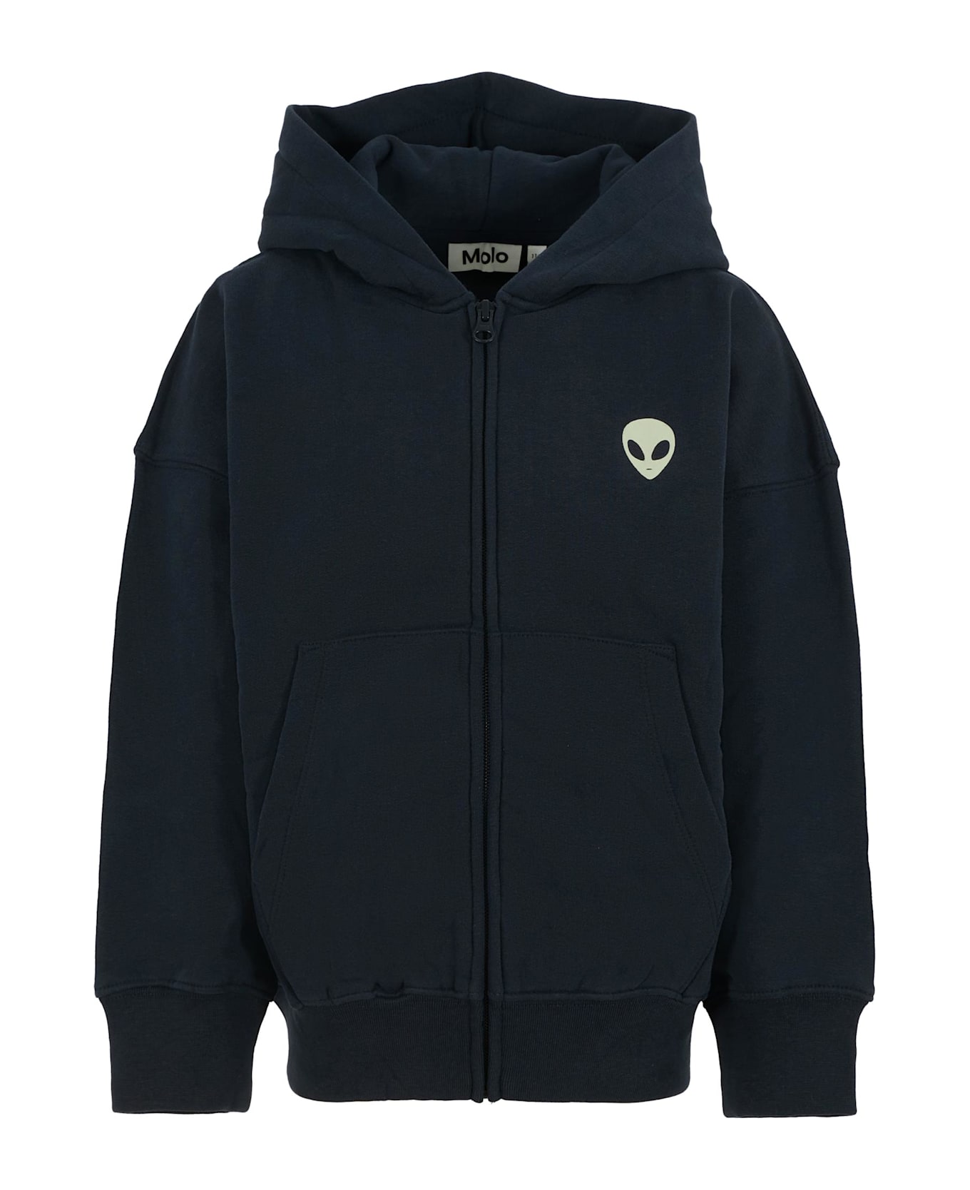 Blue sweatshirt in a fleece cotton blend, long sleeves, a hood, a front zip fastening, side pockets, and ribbed cuffs and hem. It is embellished with alien print on the chest.