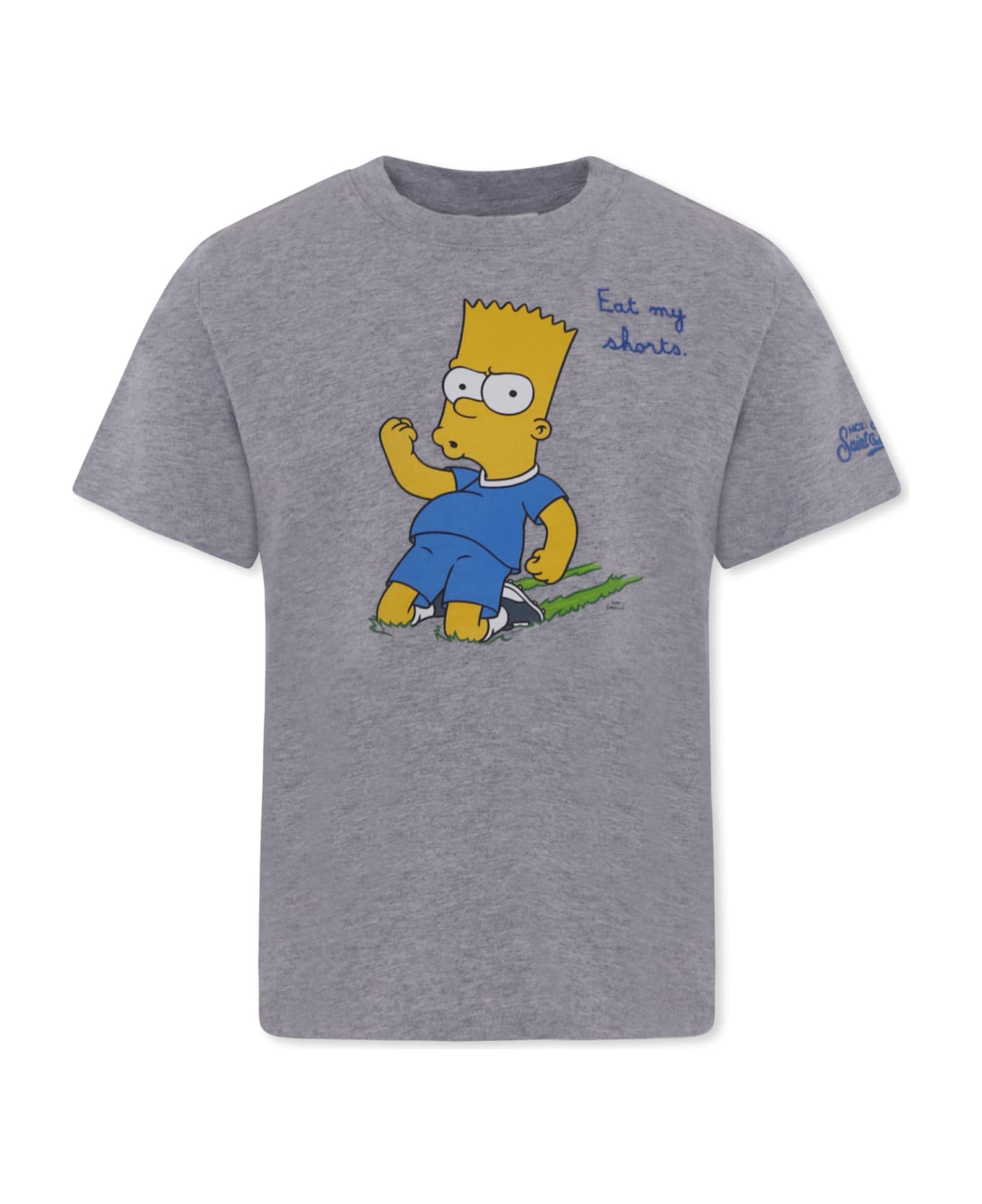 Grey organic cotton t-shirt with short sleeves and ribbed crew neck. It is embellished with Bart footballer print and embroidered writing on the front, with embroidered logo on the sleeve and writing on the back. It is a The Simpsons x Mc2 Saint Barth collaboration.