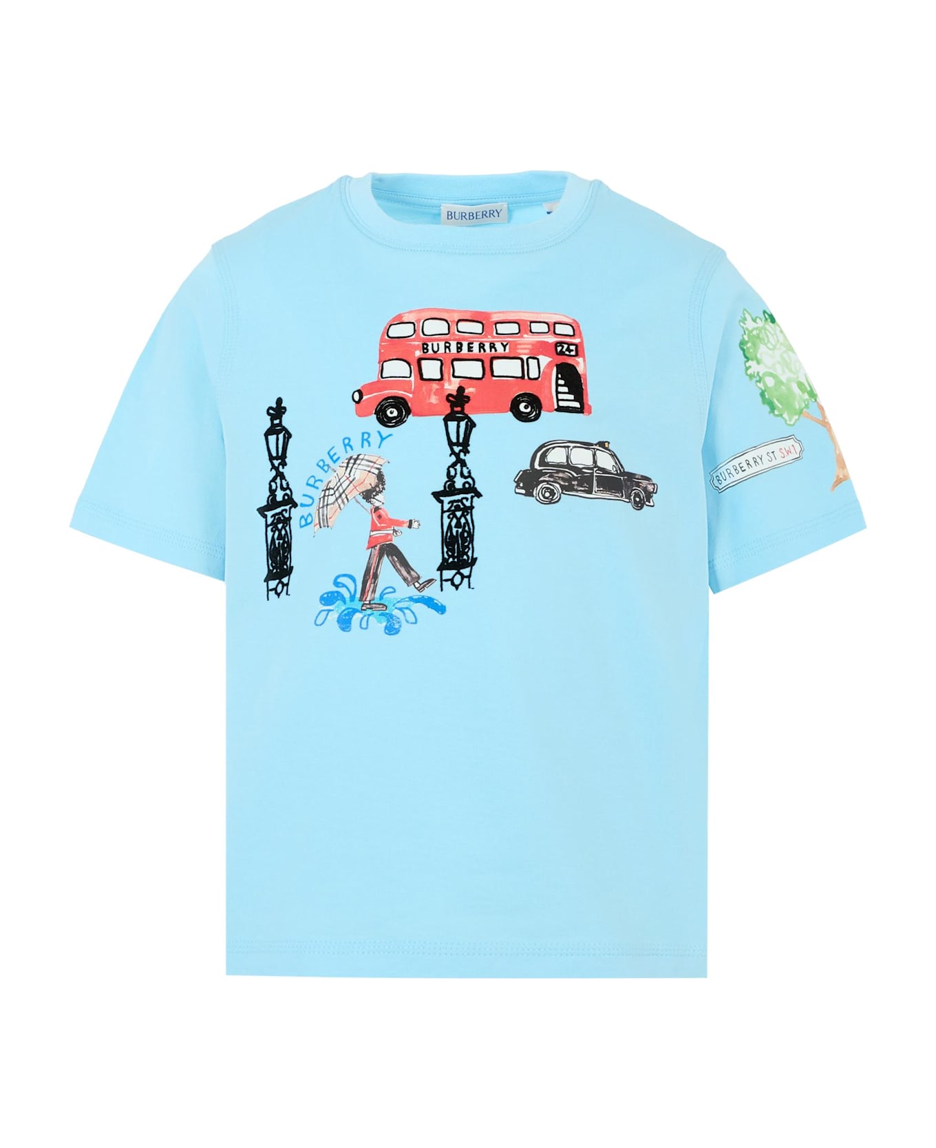 Light blue t-shirt from the luxury brand Burberry Kids, made of cotton. It has short sleeves and a ribbed crew neck. It is embellished with a red bus and umbrella print, inspired by England. This garment is made of 70% organic cotton.