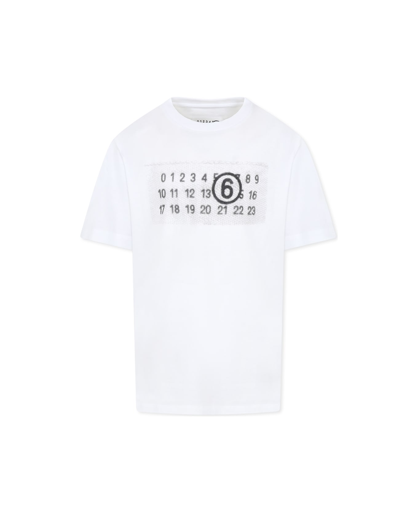 White cotton t-shirt, with short sleeves and ribbed crew neck. It is embellished with dots logo printed on the front.