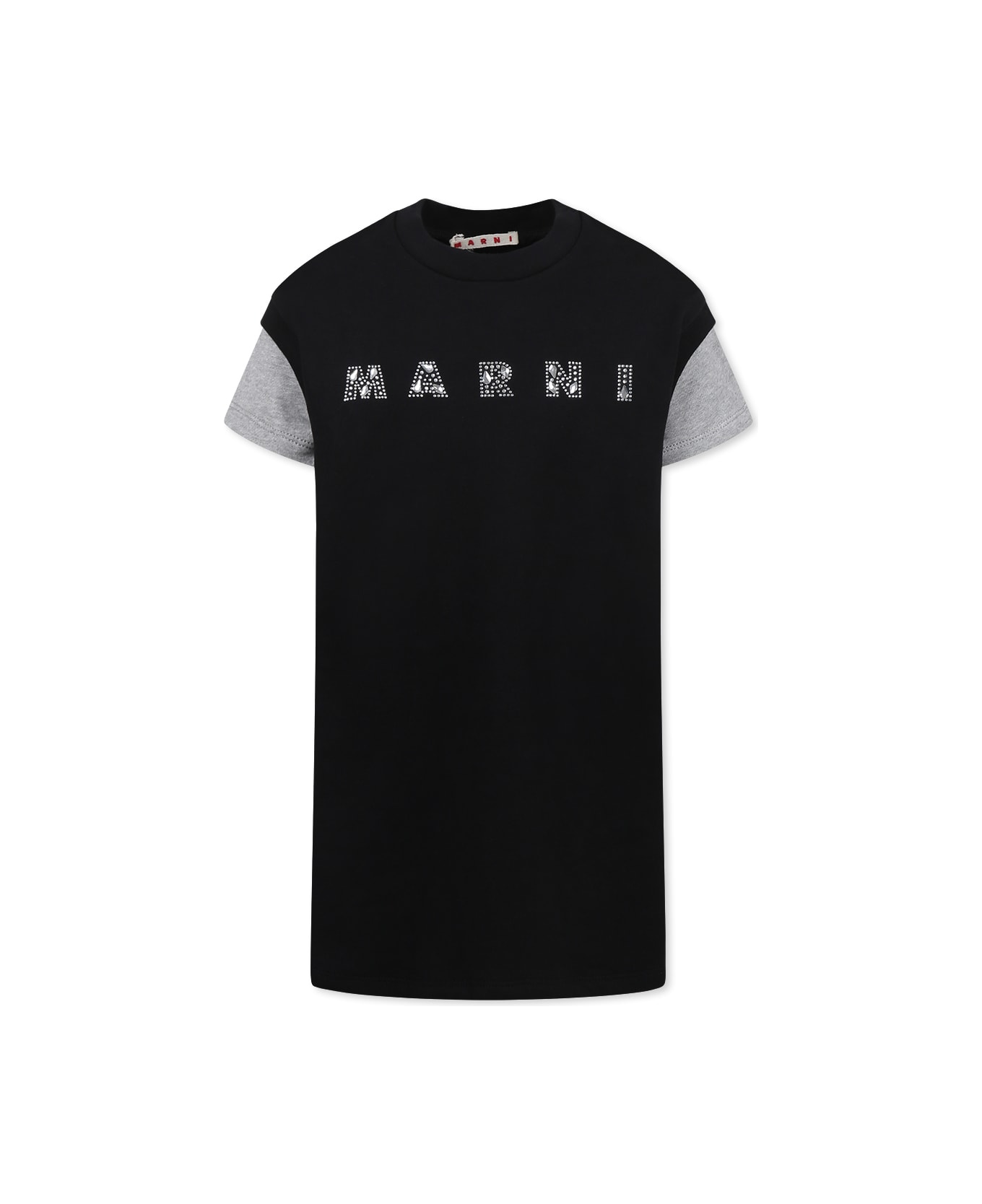 Black dress in brushed cotton, with contrasting grey short sleeves, ribbed crew neck and side slits. It is embellished with rhinestone logo on the front.