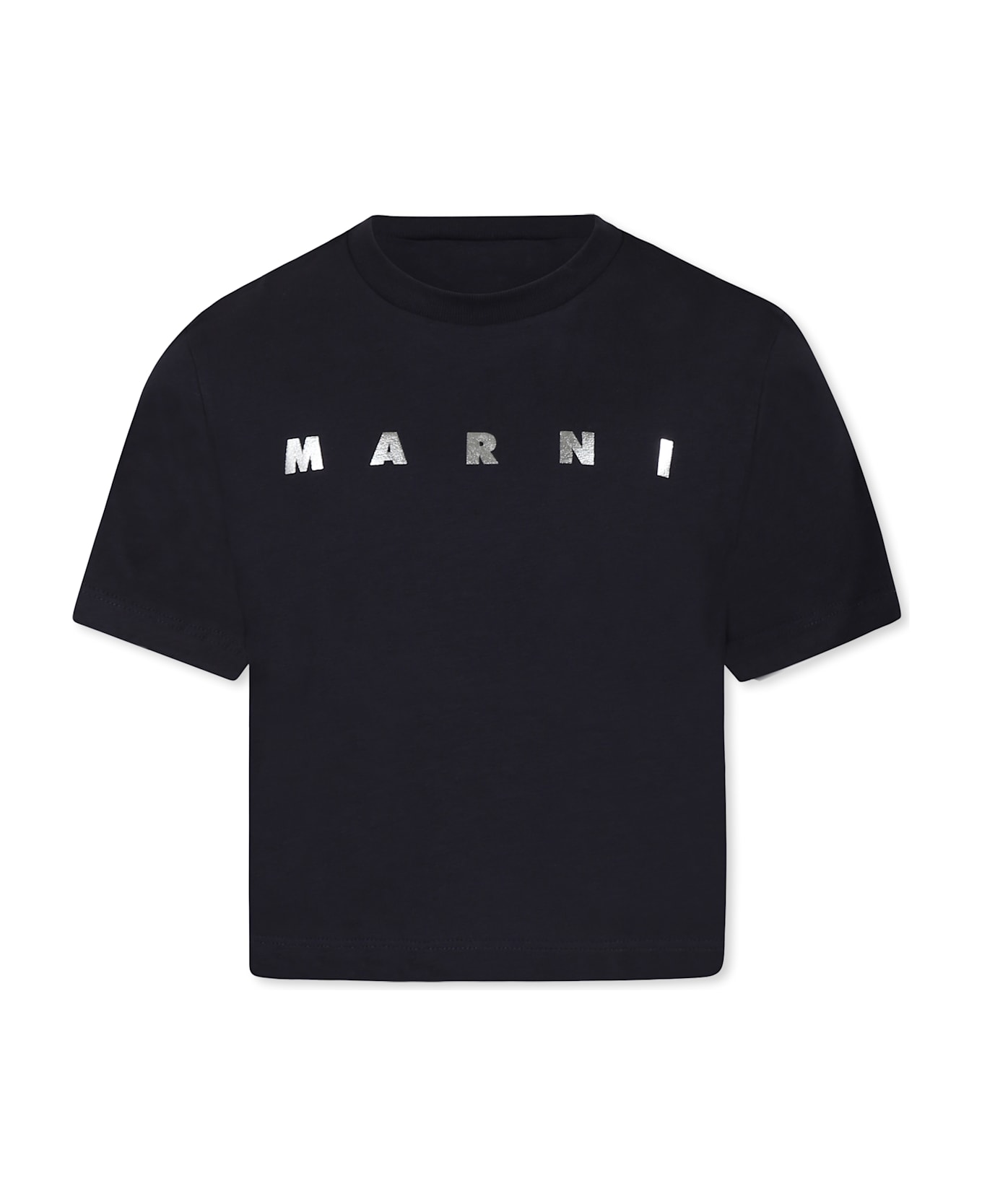 Blue crop T-shirt made of cotton, with short sleeves, crew neck and ribbed hem. It is embellished with metallic silver logo on the front.
