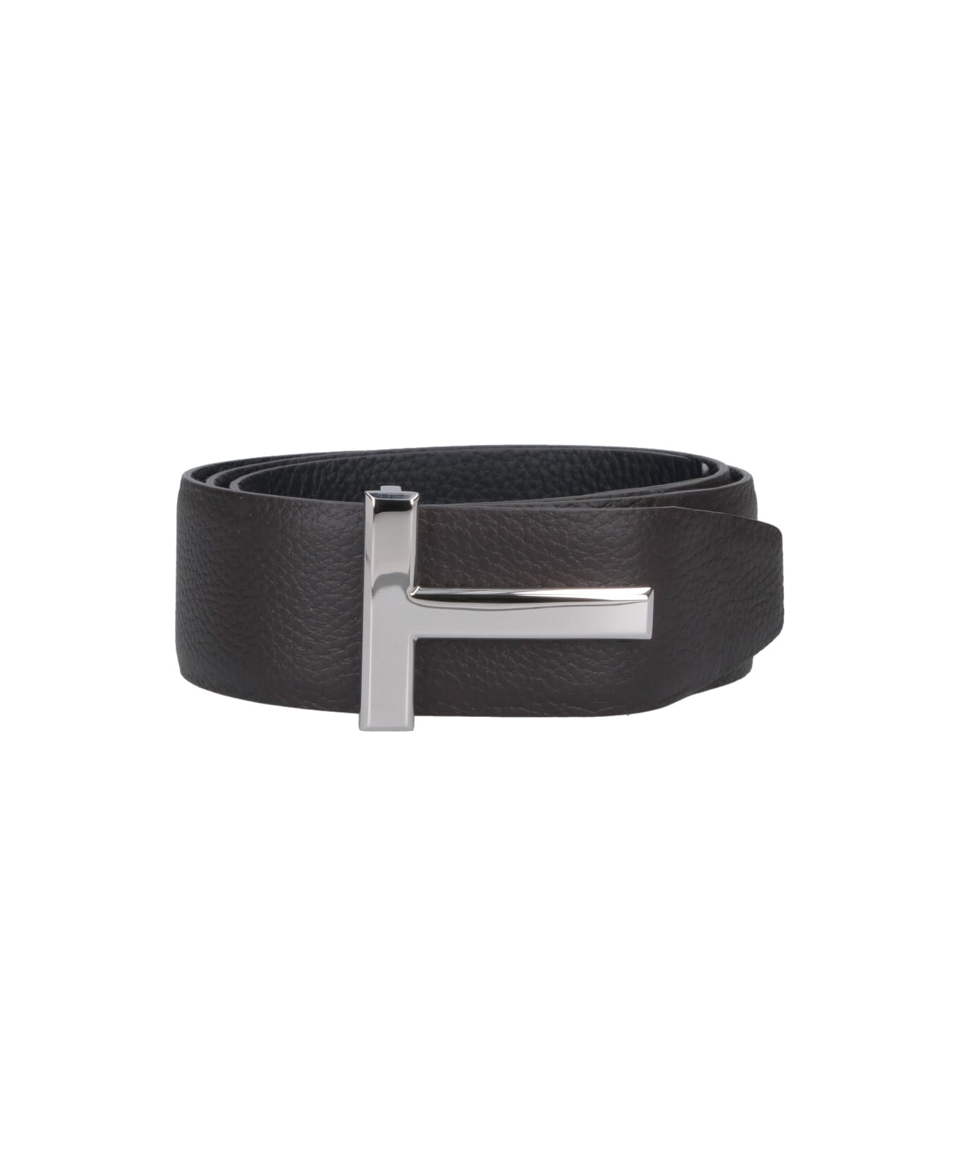 Tom Ford 't icon' dark brown hammered leather belt with silver metal 'T' logo buckle detail at the front, adjustable. Composition: 100% Calf Leather