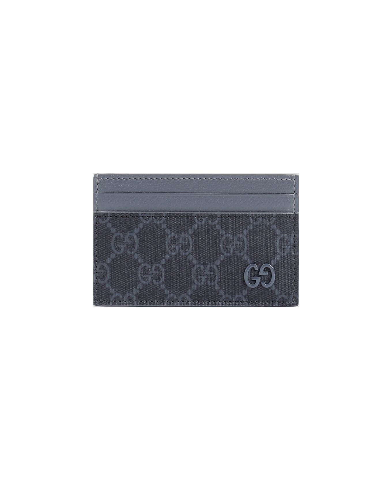 Gucci Black Steel GG Supreme Textile Wallet. Pure black steel textile supreme wallet, front blue logo, front two card slots, back two card slots, top one bill compartment, grey leather details on the top.
