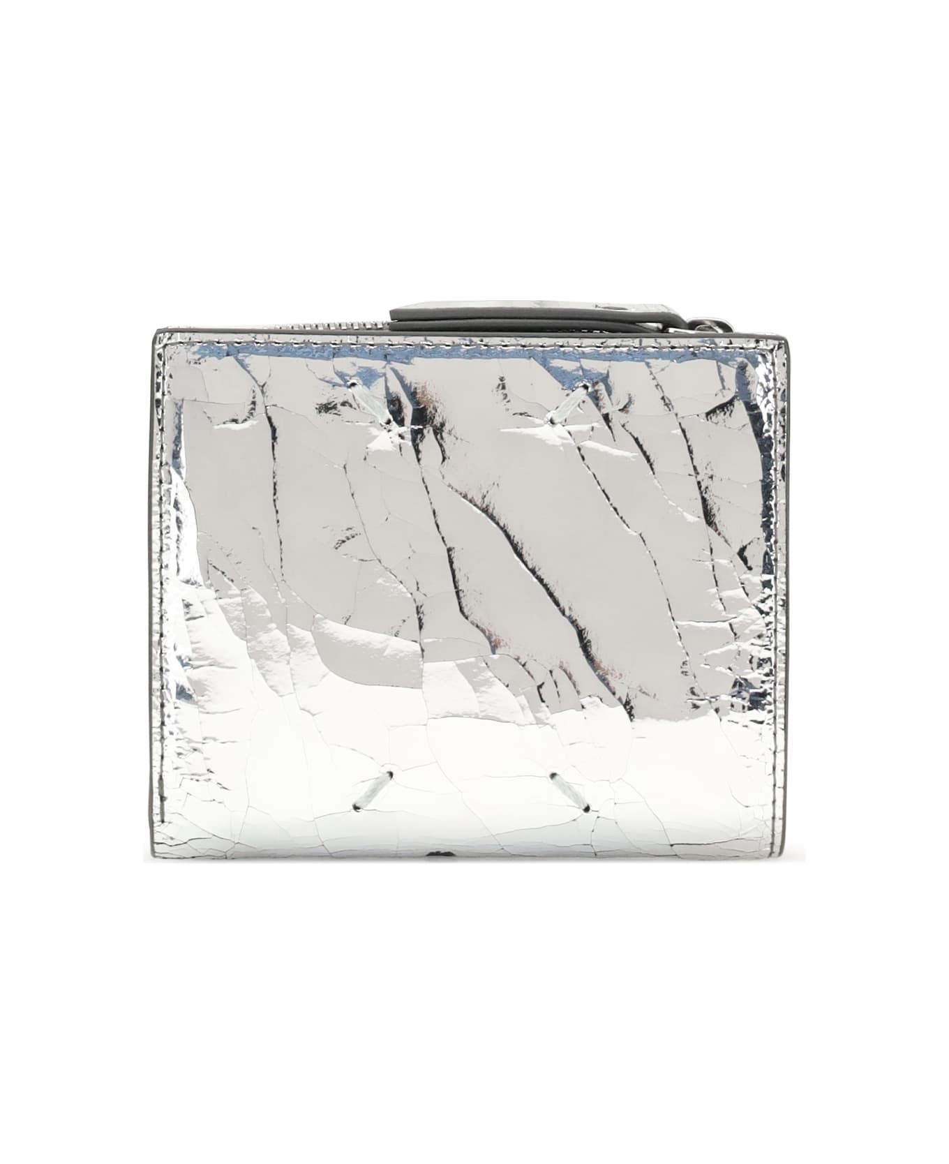 Metallic leather bi-fold wallet by margiela is crafted from calfskin in shades of silver and black, with a metallic finish and elegant texture. the compact bi-fold design includes a zippered compartment, interior card slots, and dedicated bill slots. the discreet internal logo complements the brand's minimalist and distinctive aesthetic.