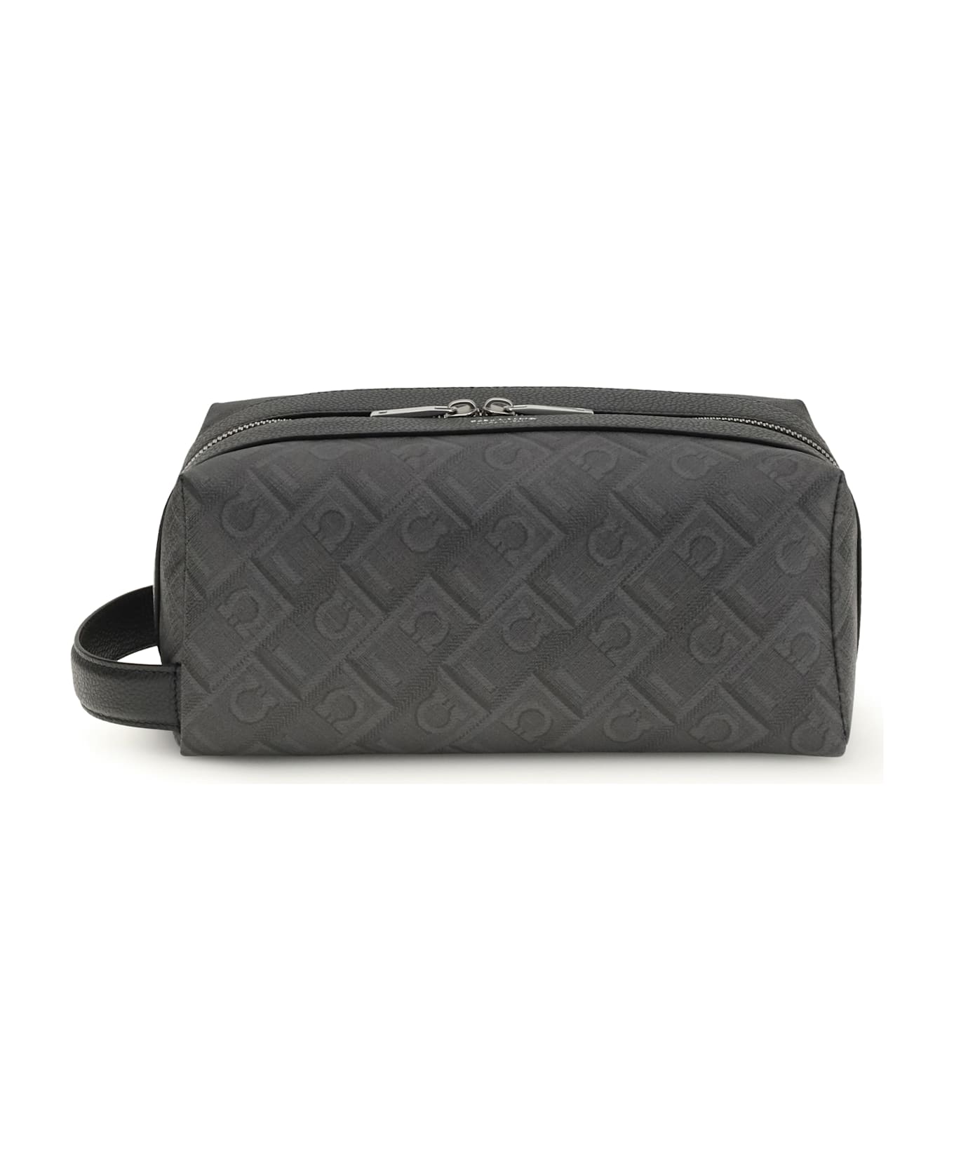 The dopp kit beauty case by ferragamo is a practical and elegant accessory, made from coated fabric decorated with the distinctive ferragamo monogram pattern. the hammered leather details add strength to the satin zip closure and handle, adding a touch of luxury. the lined interior ensures your personal items are perfectly organized, making this beauty case ideal for travel or for keeping your beauty accessories tidy.