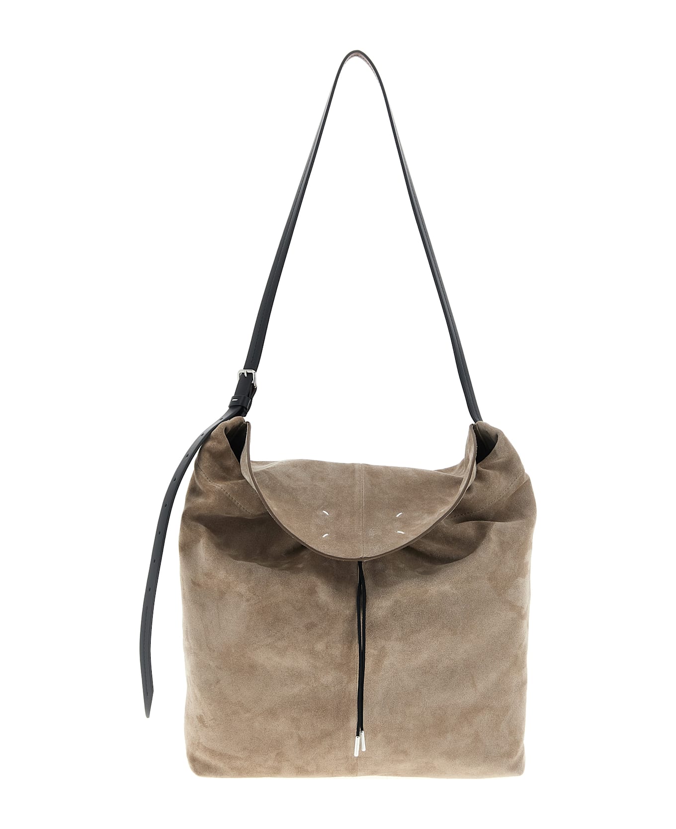 Small suede 'Drawstring Hobo' shoulder bag, flap closure with inner Four Stitches and outer 'Numeric Signature MM6' patch, inner drawstring, adjustable contrast smooth leather shoulder strap, inner clutch. Composition: 100% calfskin leather