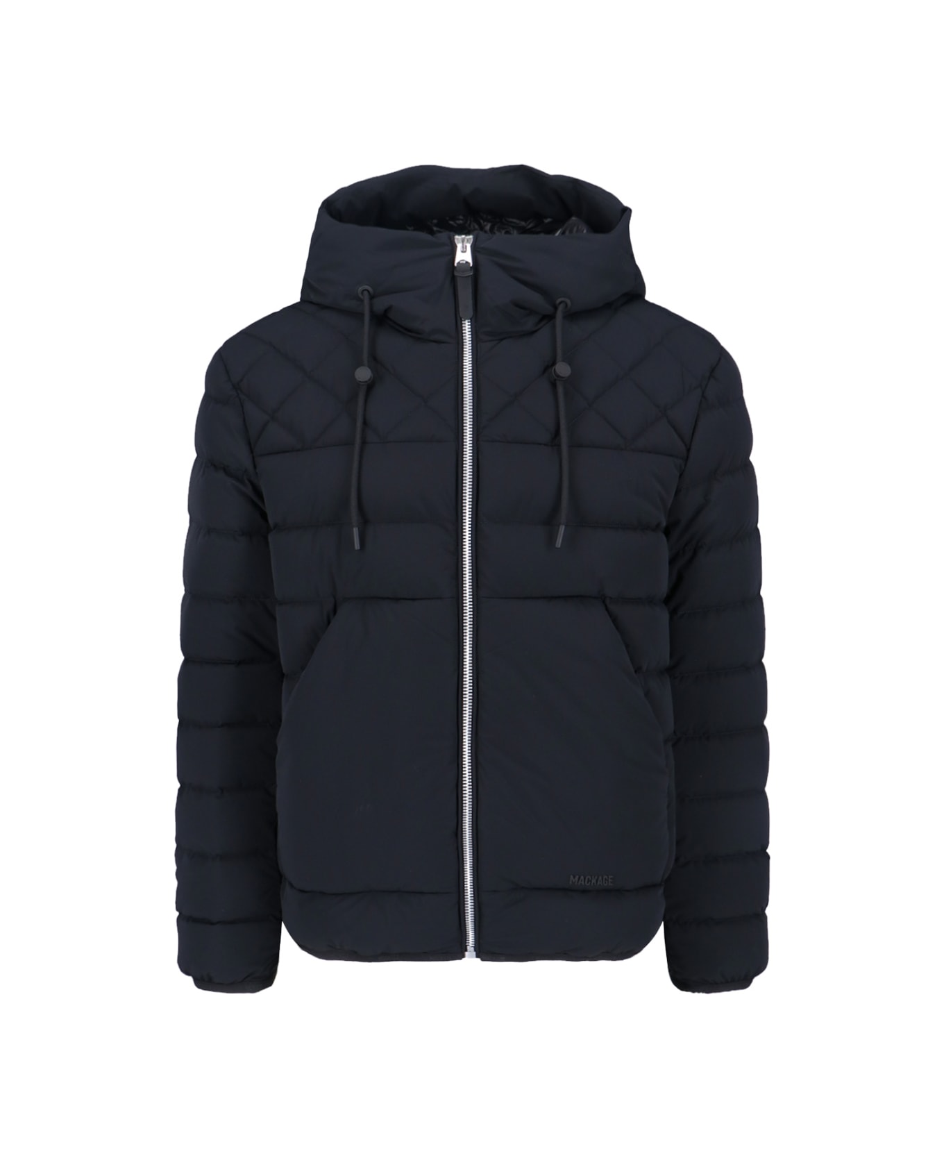 Mackage "Bergen" down jacket in black recycled fabric with quilted design, adjustable drawstring detail hood, high neck, zip closure, two front zip pockets, tone-on-tone logo on the front, elastic trims, straight hem. Composition: 100% Recycled Polyamide