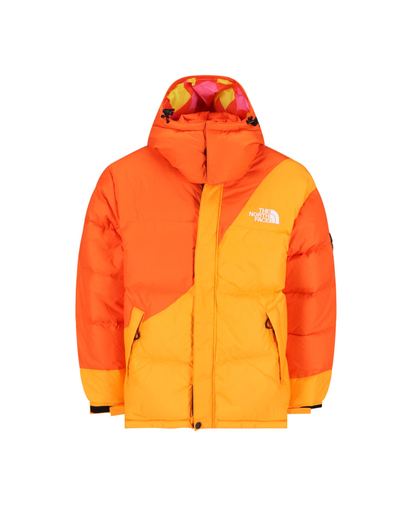 The North Face X Yinka Ilori two-tone down jacket in orange and yellow nylon with removable drawstring hood, Velcro and zip closure, logo embroidery on the chest, two side zip pockets, button on the bottom, black logo patch on the sleeve, elastic cuffs, white logo embroidery on the back, multicolor geometric pattern inside, inner zip pocket, white logo label inside, elastic hem.