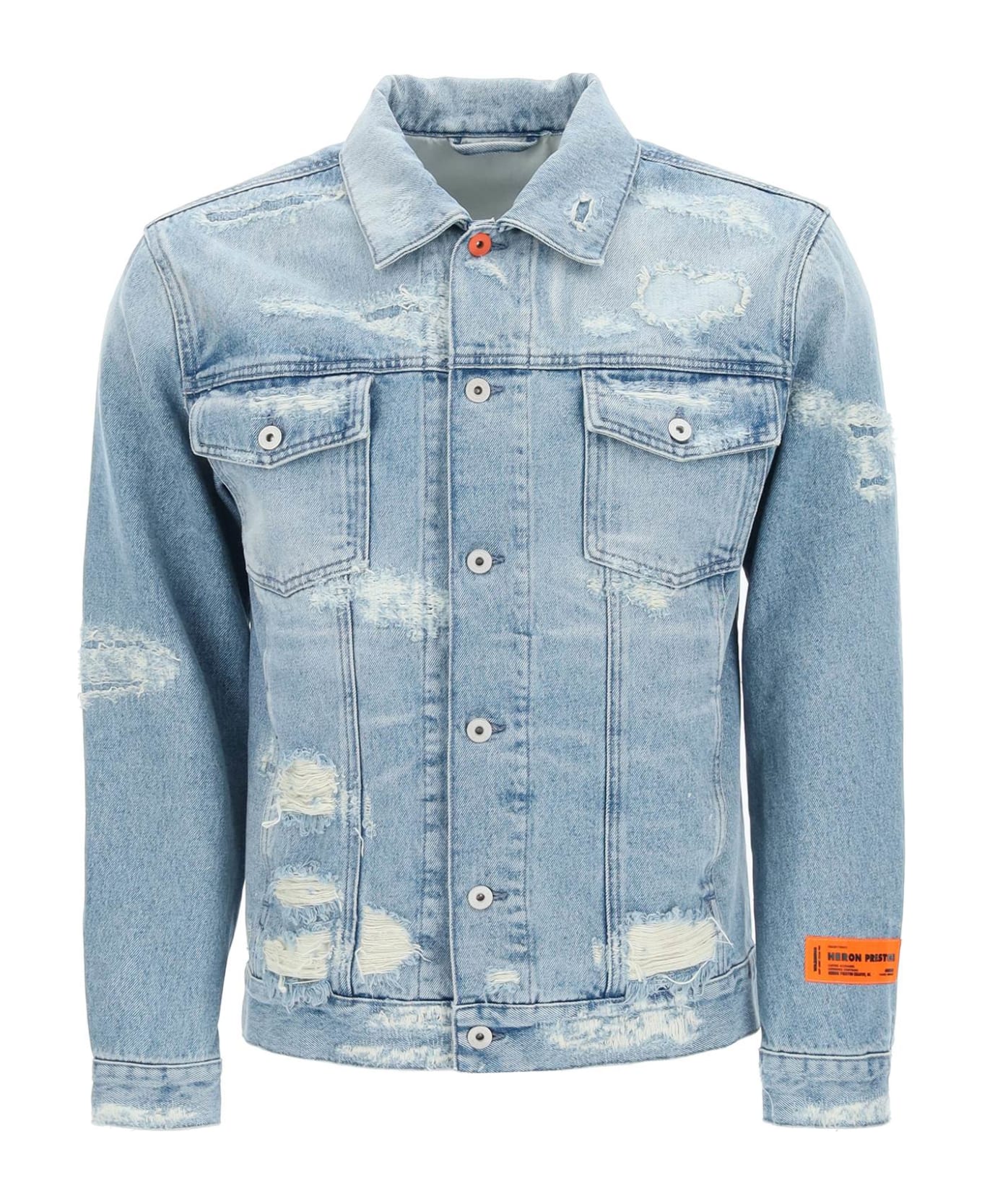 Heron Preston jacket in cotton denim, enriched by all-over distressed detailing. Button front detailed with contrast top button, logo patch at lower sleeve and hem. Adjustable waistband with button tabs. The model is 187 cm tall and wears a size L. Composition: 100% cotone