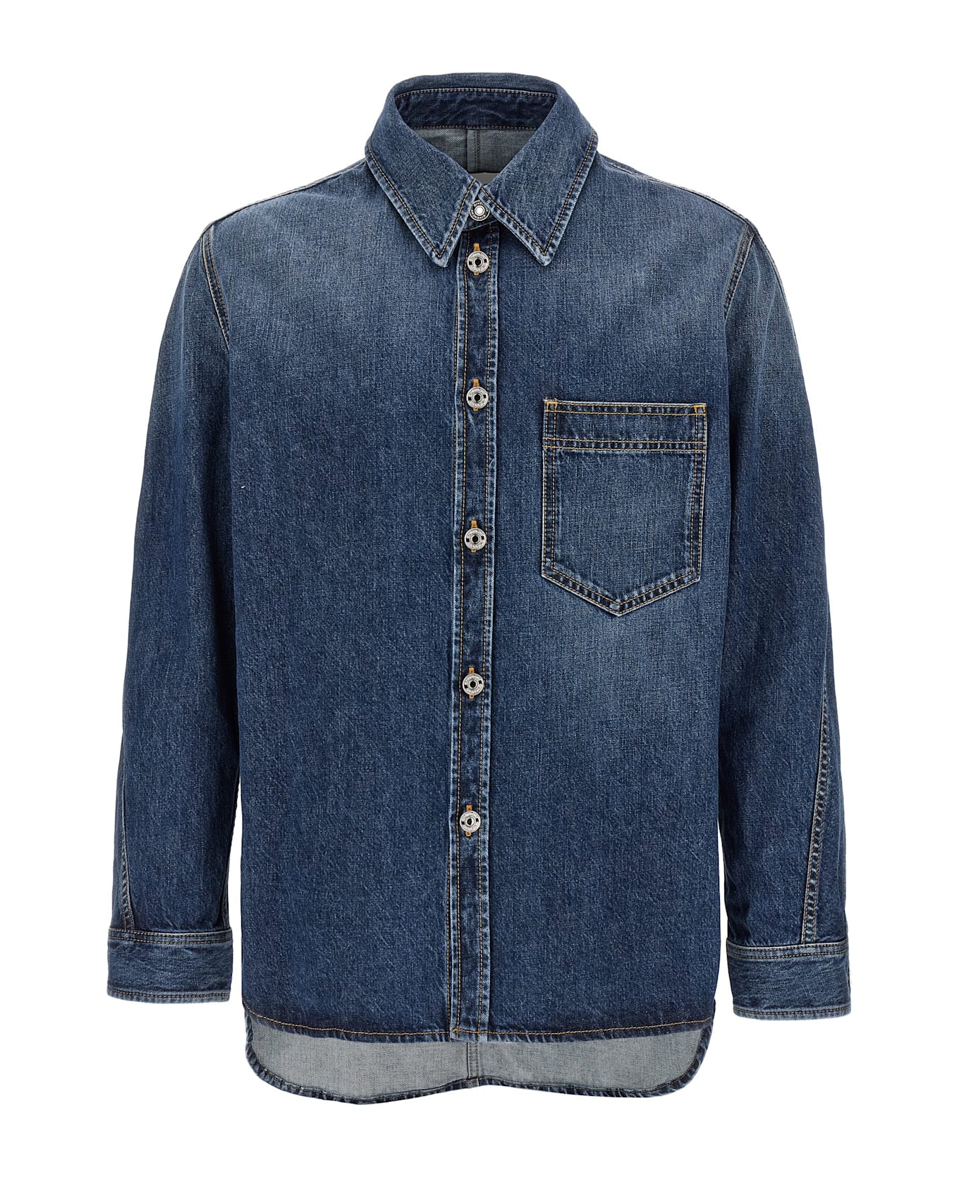 Cotton denim overshirt, collar, front button closure, chest pocket, back leather logo patch, long cuffed sleeves. Composition: 100% cotton