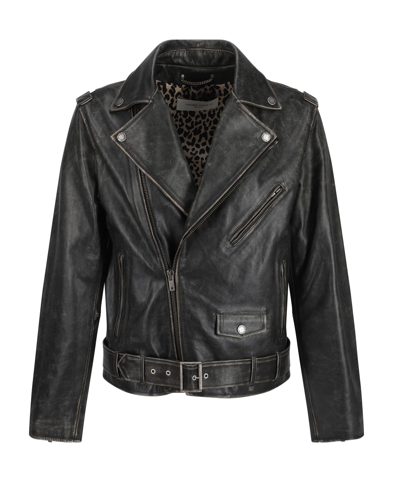 Leather golden biker jacket by golden goose, worn vintage effect design, double-breasted front zipper closure, large classic lapels, two vertical welt pockets with zipper for closure, leather waistband adjustable by metal buckle, welt pocket on front, front flap pocket closable by magnetic button, sleeves adjustable by zipper, regular fit.