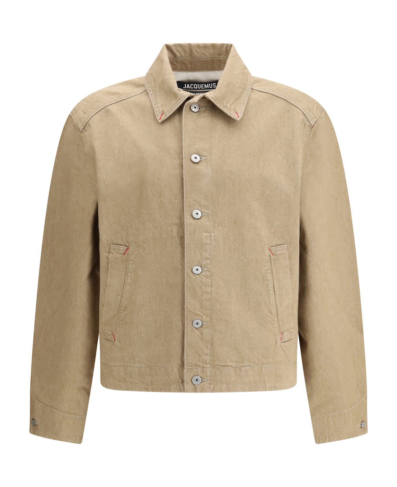 The mirada de-nîmes denim jacket by jacquemus features a cropped, straight silhouette that blends character with clean tailoring. crafted from beige denim, it is defined by a pointed collar, engraved metal buttons, and silver-tone metal finishes that enhance the design. buttoned cuffs, two welt pockets, and contrast stitching complete this essential and versatile piece, perfect for contemporary, effortless looks.