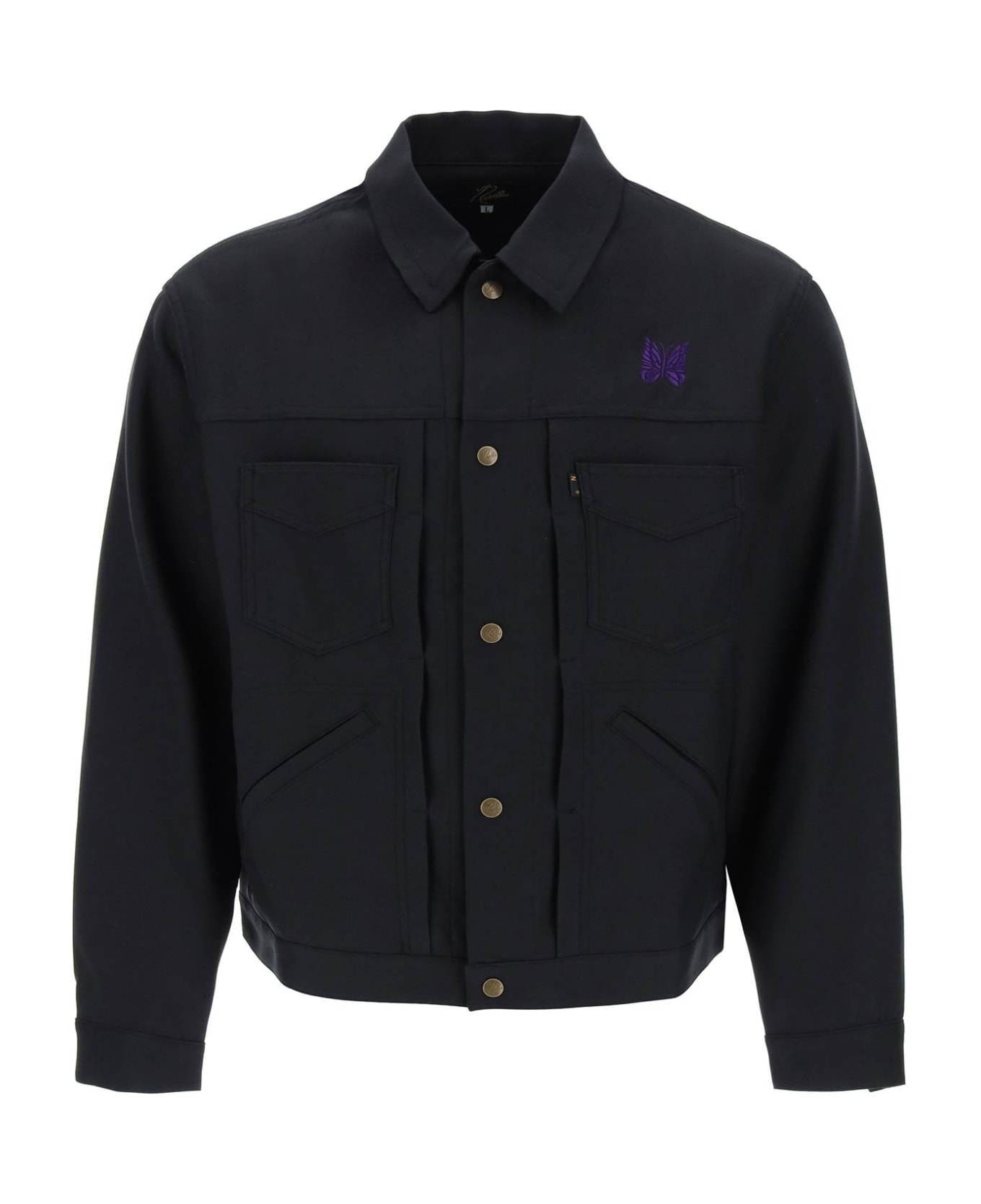 Needles jacket crafted in technical twill. It features pointed collar, front snap button fastening, chest patch pockets, side slanted pockets and snap cuffs. Embellished with contrasting logo embroidery on the chest. Regular fit with boxy cut. The model is 187 cm tall and wears size L.
