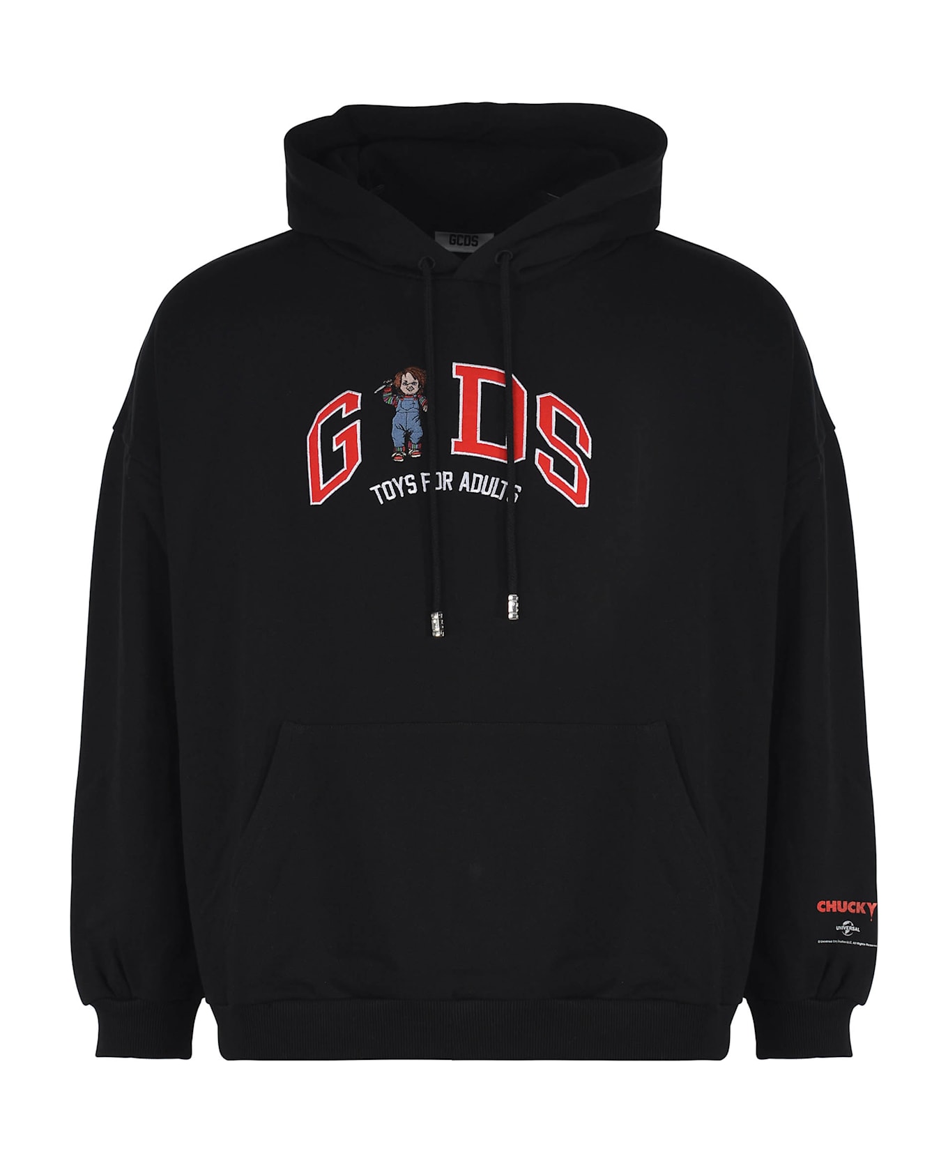 GCDS Chucky hoodie. Made of black cotton. Adjustable hood with drawstring. Long sleeves. Kangaroo pocket. Ribbed cuffs and bottom. Contrasting "GCDS Lounge Chucky" logo applied on the chest. Chucky writing on the sleeve. 100% cotton