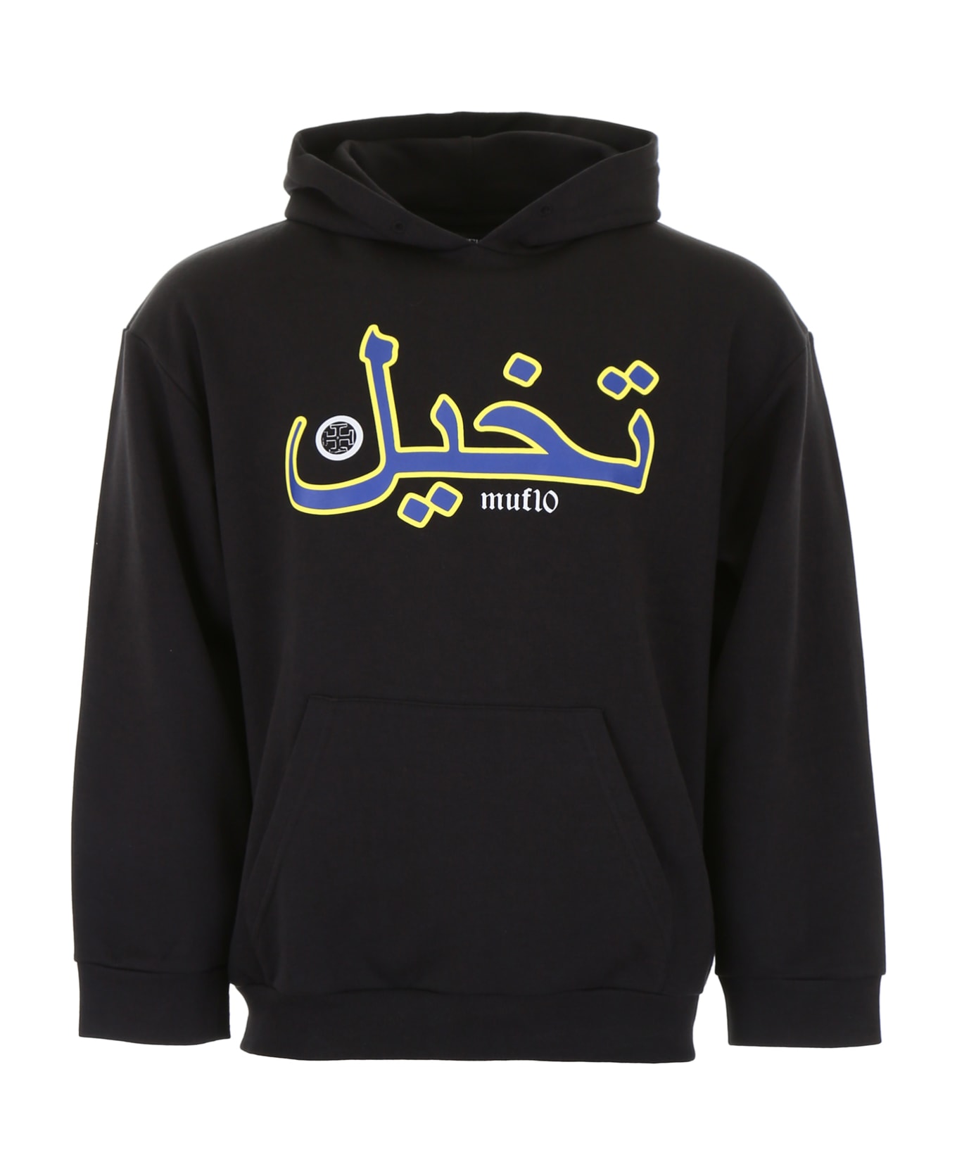 MUF10 techno cotton hoodie with contrast print on the front and "Imagine" print and logo embroidery on the back. Kangaroo pocket, oversized fit. Model height is 182 cm and he is wearing a size M.