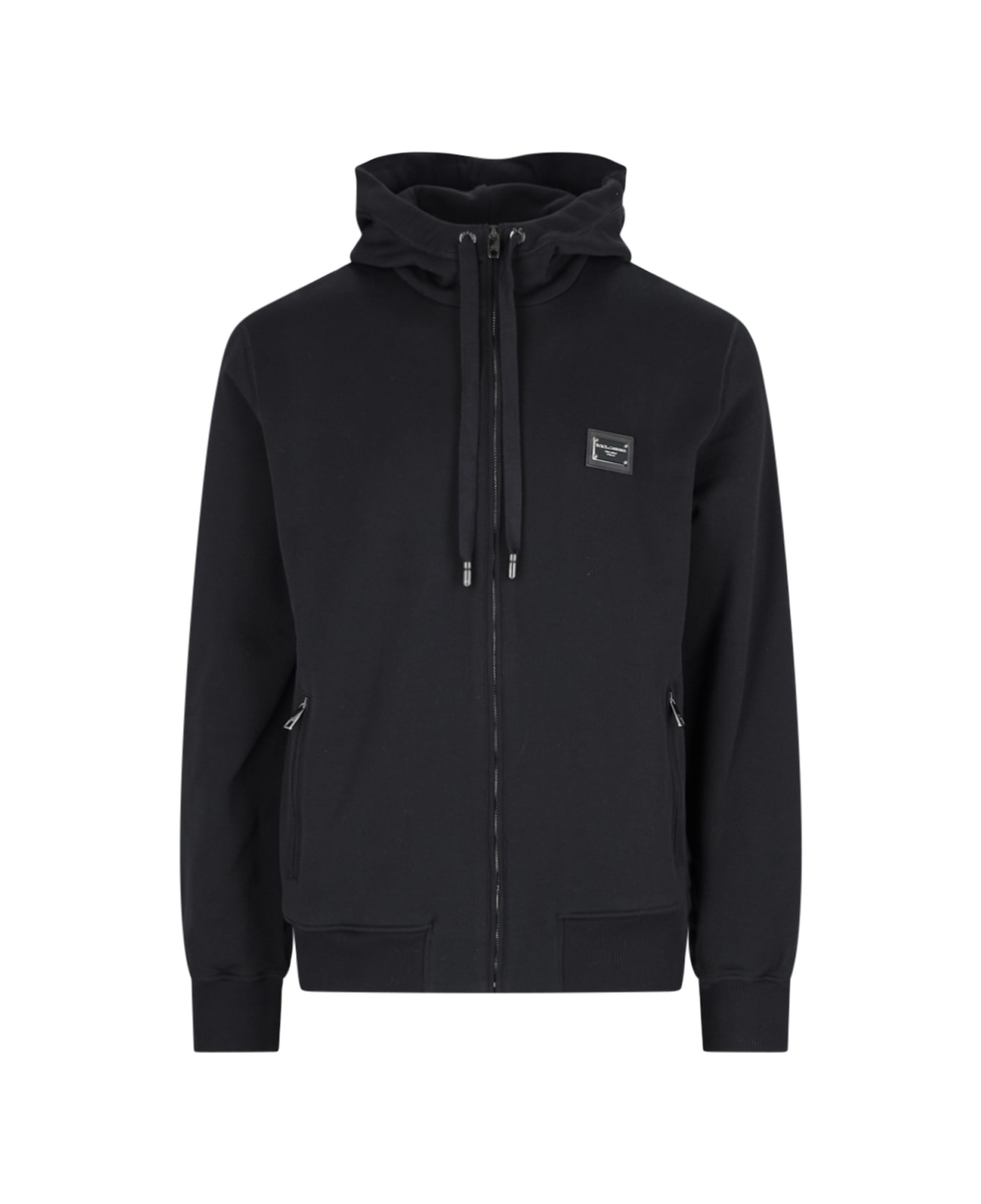 Dolce & Gabbana black cotton hoodie with zip closure, drawstring hood, metal logo patch, two side zip pockets, ribbed elastic cuffs and hem, straight hem. Composition: 100% Cotton