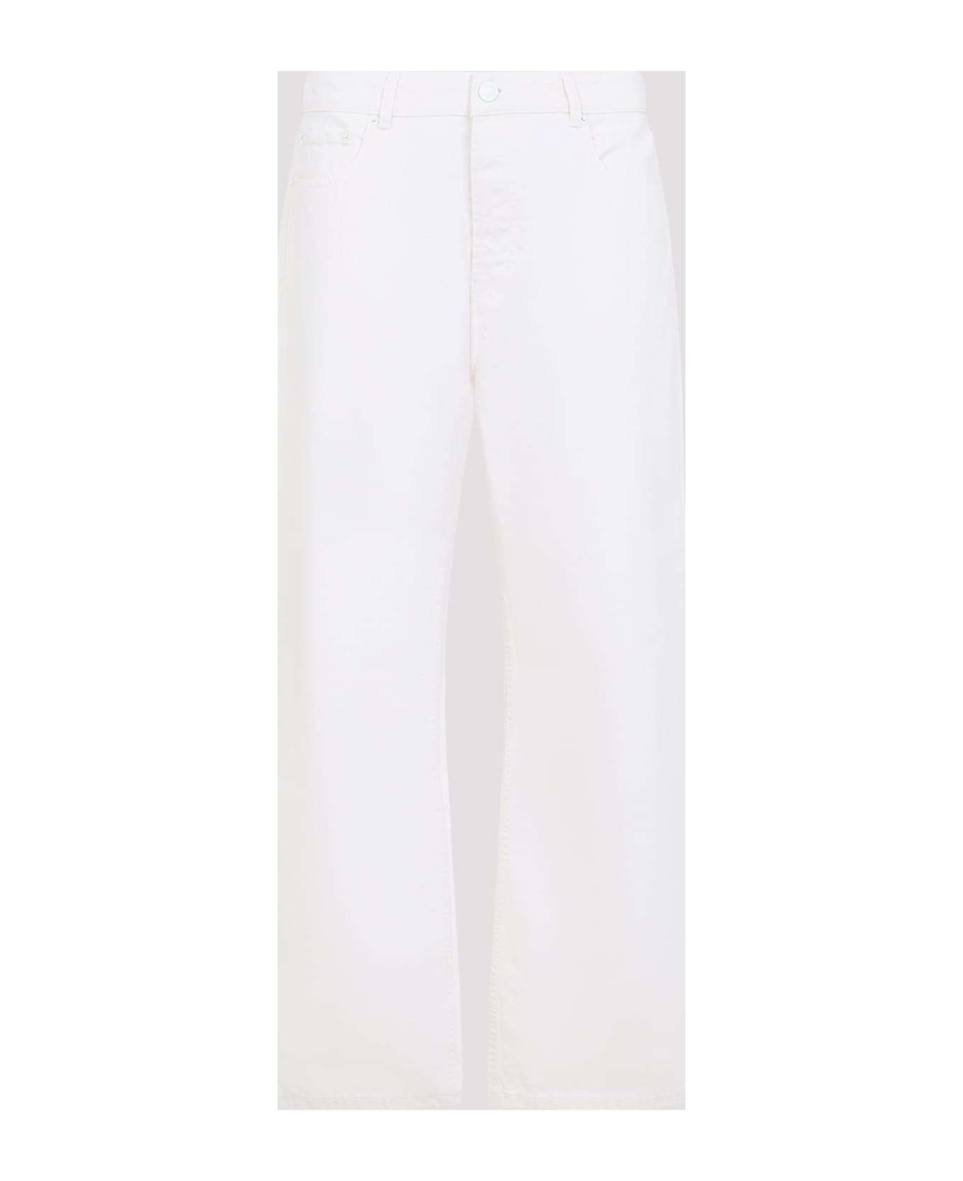 Ami Paris Large Fit White Cotton Jeans. Crafted from white cotton twill, featuring a 5-pocket construction, a mid-rise, belt loops, a front button and zip-fly fastening, a branded leather label at the back of the waist, and a wide leg.