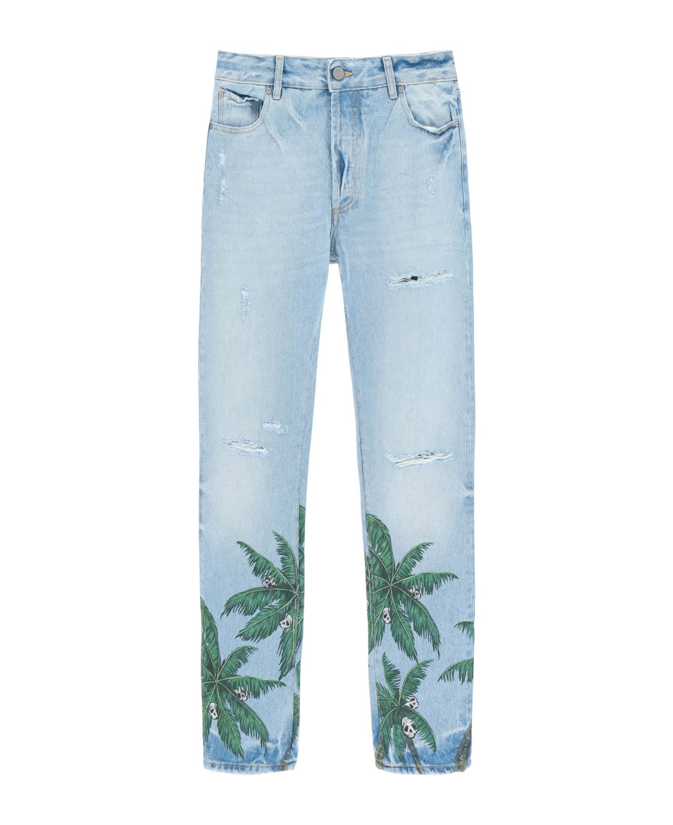 Palm Angels five-pocket jeans in light-wash distressed denim, with Palm Tree motif printed at the hem. Regular fit with low-rise waist and straight leg, finished with belt loops and button fly. The model is 187 cm tall and wears a size 31.