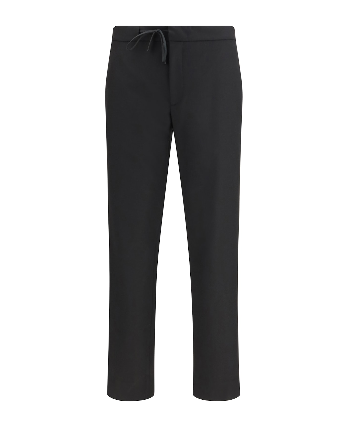The drawstring tailored trousers by maison margiela reinterpret classic tailoring with a contemporary, relaxed attitude. crafted from black wool, they feature a drawstring fastening and zip fly, combining comfort and refinement in a distinctive balance. the straight-leg silhouette is completed with side and back pockets, while the iconic white stitching on the back signs the piece with the maison s unmistakable aesthetic code.