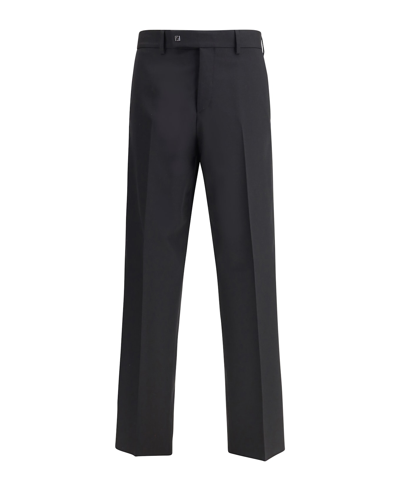 The trousers in cotton gabardine by fendi reinterpret classic tailoring with a refined and contemporary spirit. the cigarette cut enhances balanced proportions, enriched by side pockets and a pressed crease that evoke traditional craftsmanship. belt loops and a concealed zip fastening with hook bring functional elegance, while the precisely measured hemline sharpens the modern silhouette. the unmistakable micro ff logo in palladium-finish metal, applied as a button effect, completes the piece with a distinctive signature detail.