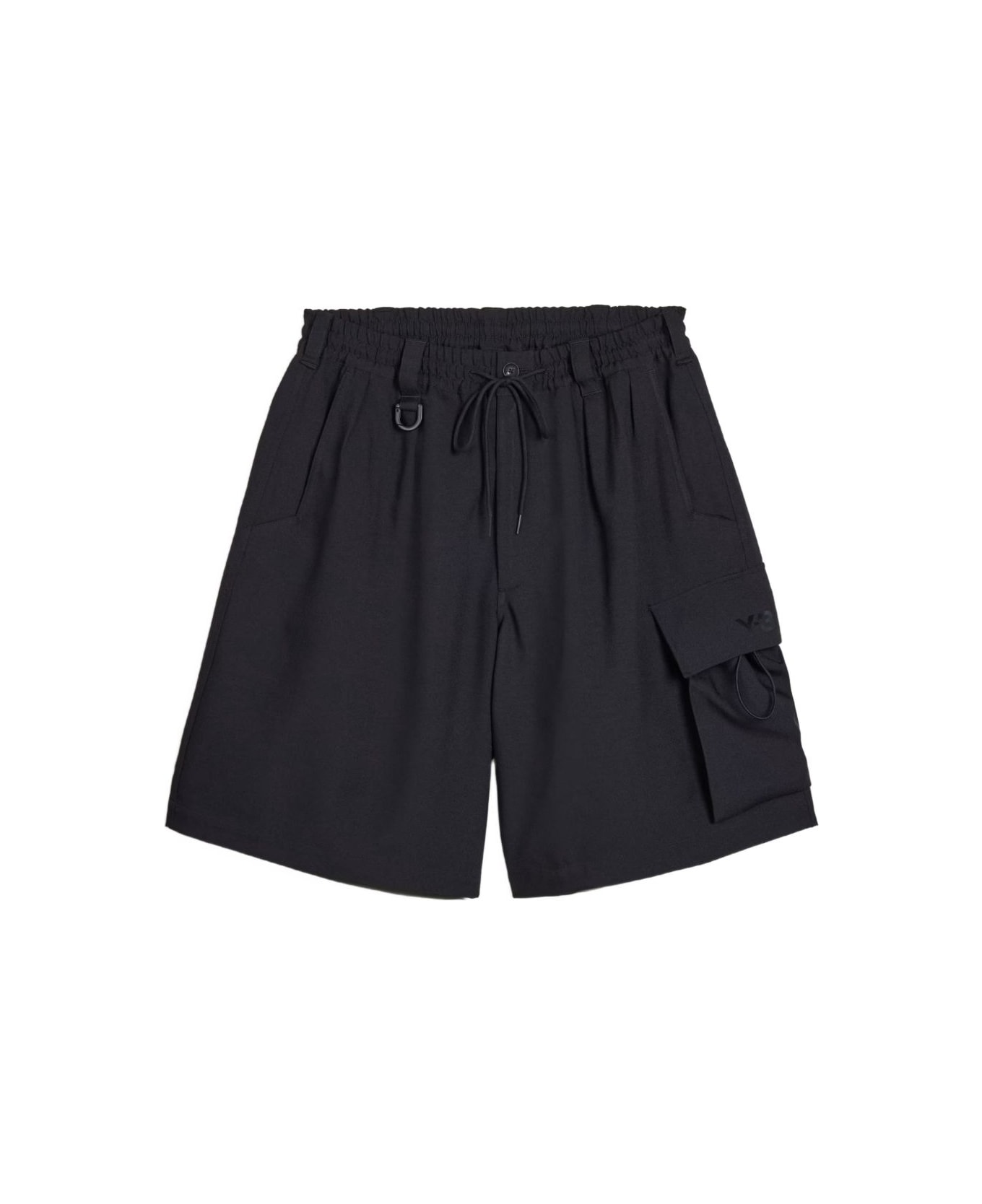 black elasticated waistband drawstring fastening side cargo pocket back welt pockets
