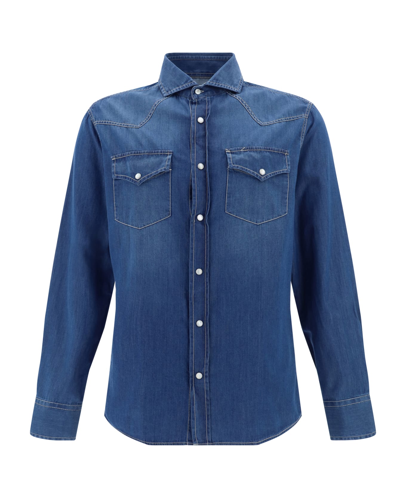 Cotton shirt by brunello cucinelli, classic collar, front fastening with pearlised snap buttons, two patch pockets on the front with flap for closure, adjustable cuffs with button fastening, contrasting stitching, regular fit.