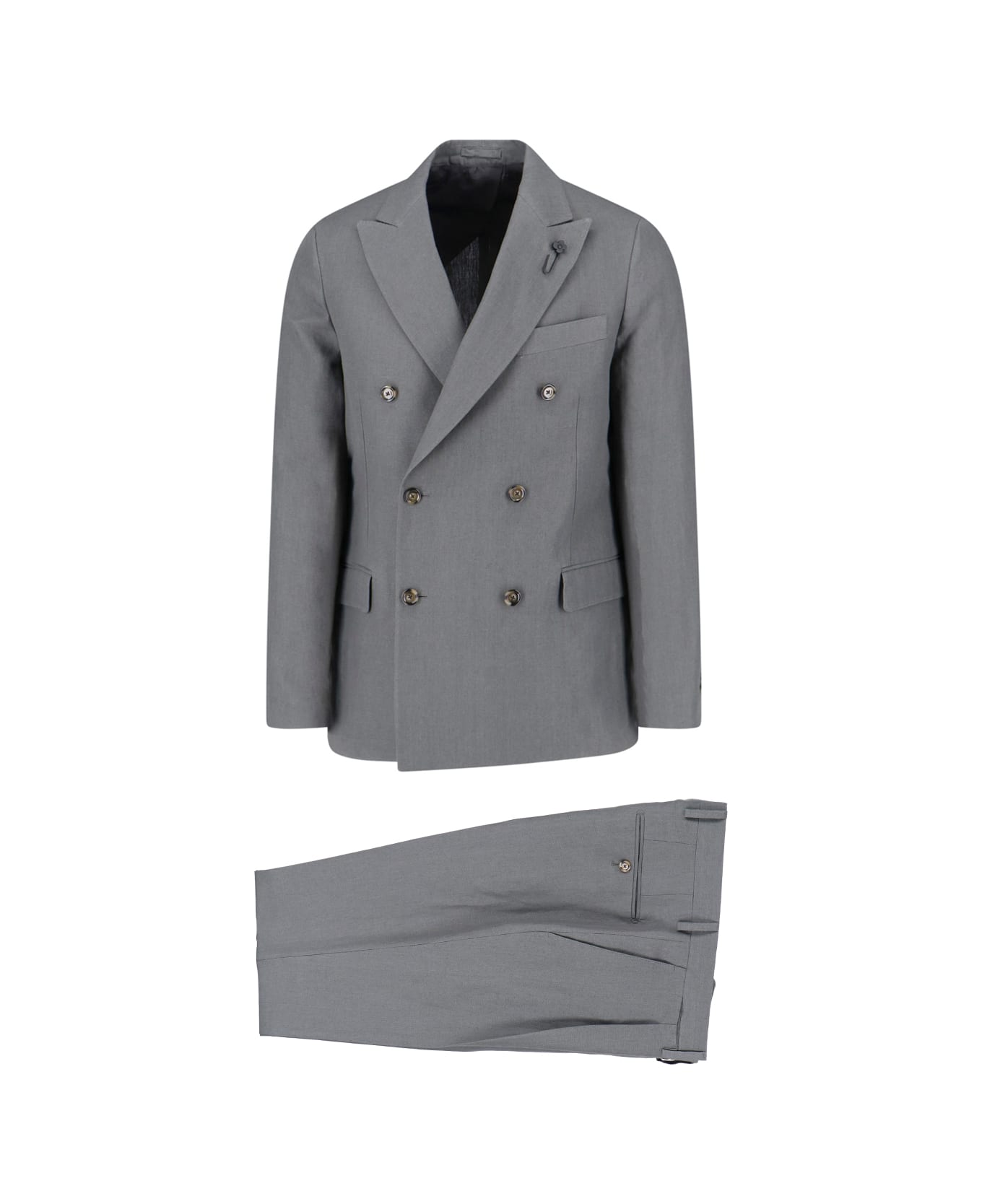 Lardini linen double-breasted grey suit with lapel blazer, metal logo detail, double-breasted button closure, chest pocket, two side flap pockets, central back split, buttons on the cuffs, straight hem, straight trousers, mid waist, belt loops, button and zip closure, two side pockets, two back welt pockets, straight leg.