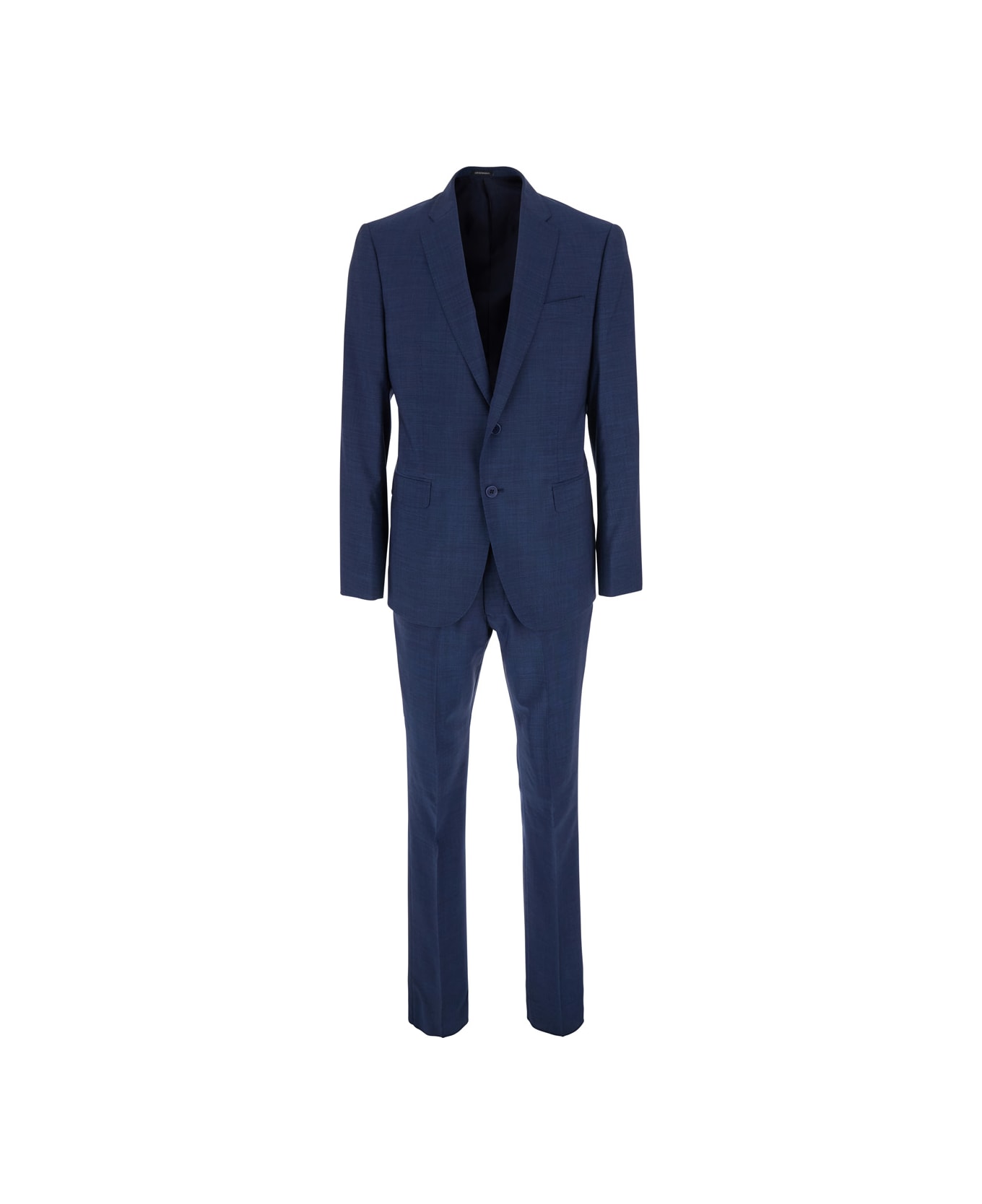 Emporio Armani 'SUIT' in blue. Jacket with classic collar and two-button closure. Features welt pockets on the front and a single vent on the back. Trousers with zip and button closure, side pockets, and welt pockets on the back. Made of fabric. Regular fit. Composition: