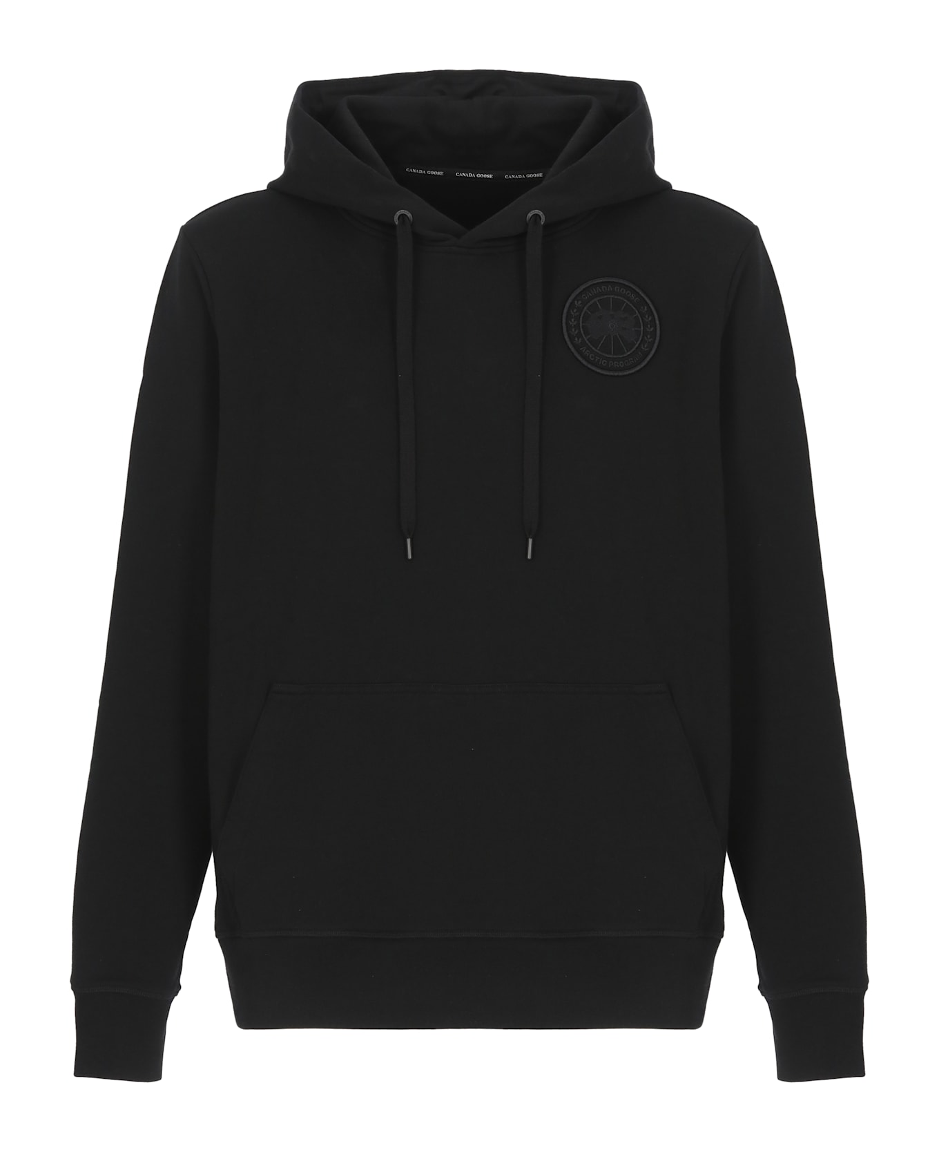 - Black Canada Goose cotton hoodie for man - Hood with drawstrings - Long sleeves - Front tone on tone logoed embroidered patch - Elastic ribbed trims Composition: 100% Cotton