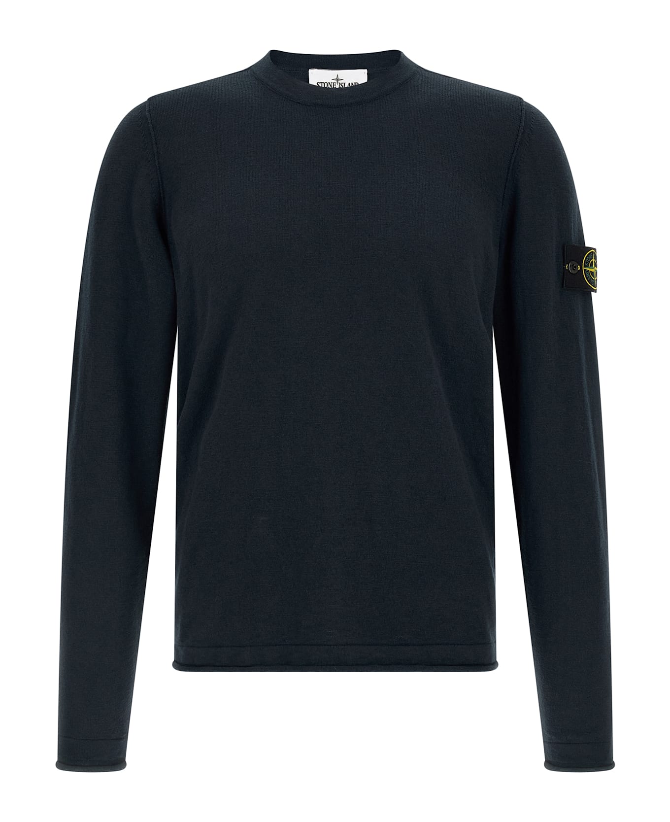 '5100052' knit sweater in 14 fineness shaved cotton and nylon blend knit, crew neck, long sleeves with cuffs and logo badge appliqué. Composition: 78% cotton, 22% polyamide