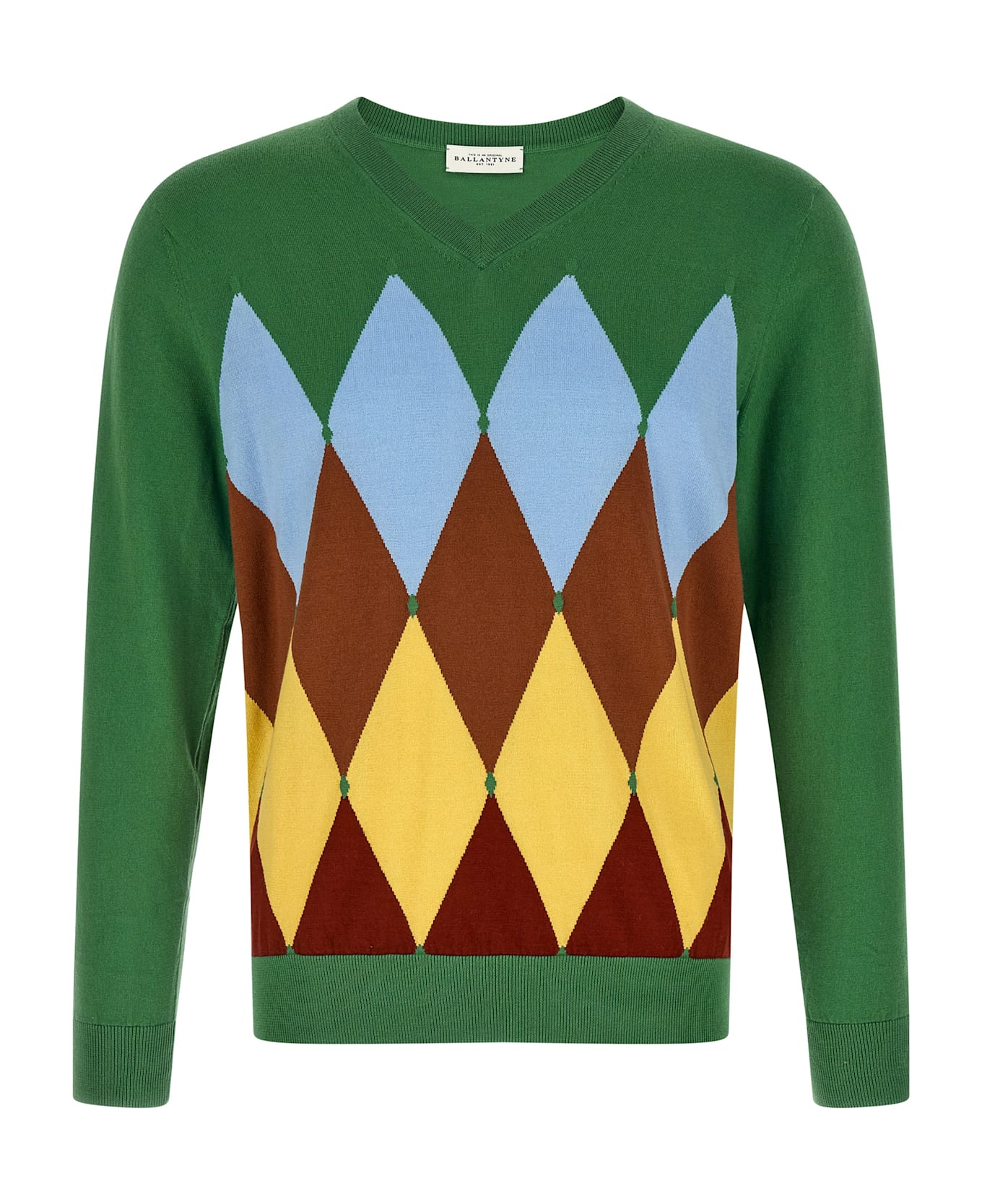 Cotton and cashmere blend sweater with front Argyle jacquard pattern, V-neck, long cuffed sleeves, and headband on the hem. Composition: 85% cotton 15% cashmere