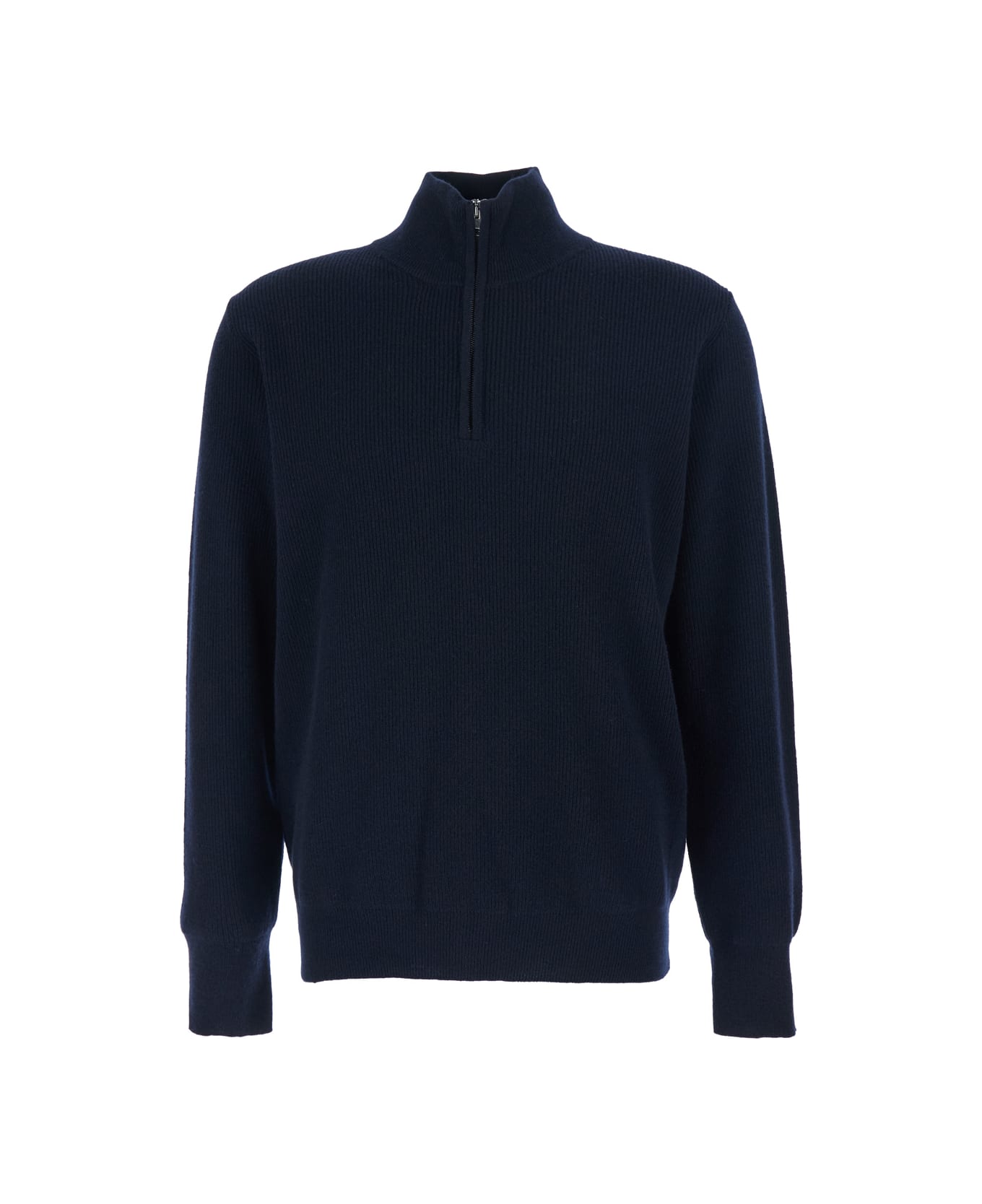 Blue Ribbed Knit Sweater With High Neck And Half Zip Closure In Wool Man